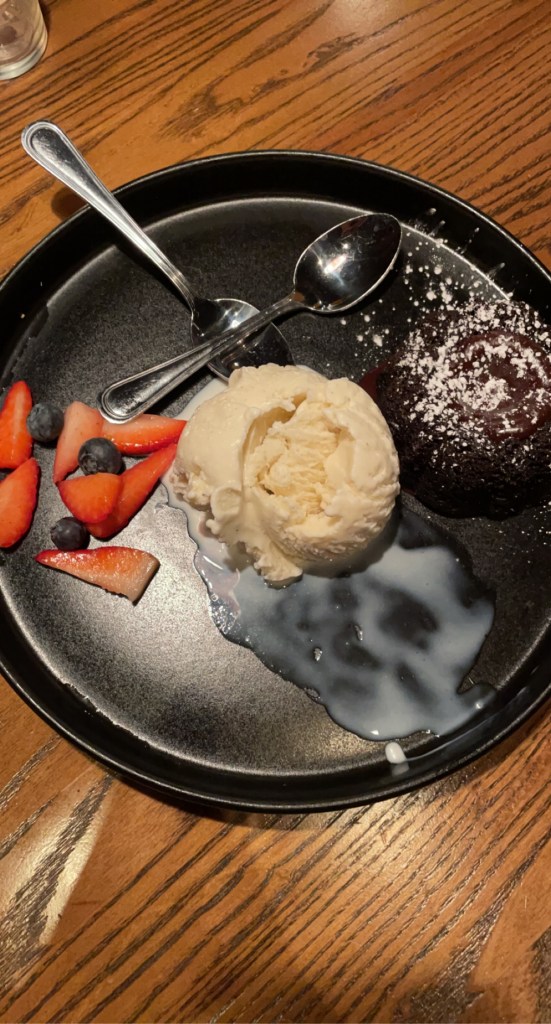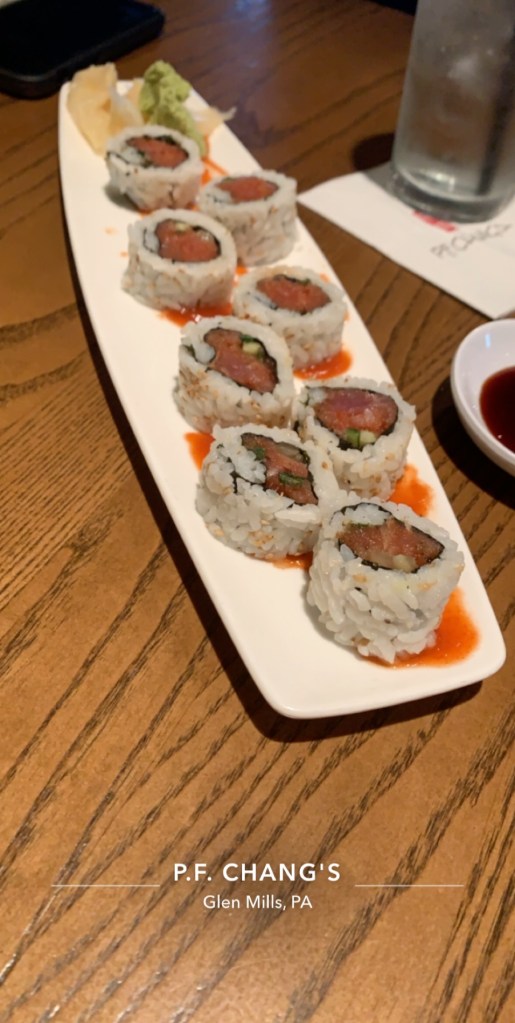 Menu: Their menu has so many options. It is hard to decide what to try and order! Like the drinks, I try to get something new every time we go. We have tried some of their sushi rolls🍣, the Shrimp Tempura Roll and Spicy Tuna Roll (this was a bit too spicy for me 😛). The pork dumplings 🥟 are so good too! We have tried the Combo Fried Rice, Pork Lo Mein, Combo Pad Thai, Tonkotsu Ramen🍜 and Mongolian Beef. Honestly can’t say one bad thing about any of the entrees. I would get everything again. The Mongolian Beef was probably my favorite. When it comes to dessert, I was so sad they were out of the Bar Donuts. I have heard so many good things about them, but I have yet been able to try them. But I can say and recommend the chocolate lava cake – you can never go wrong with chocolate! Explore more of PF Chang’s menu here.