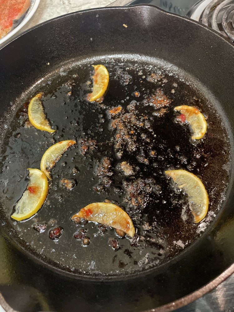 Salmon: I season the salmon filets with salt, pepper, a bit of old bay and dill. Then add a bit of lemon juice to each fillet. For the glaze, mix honey, sriracha, soy sauce and sweet chili sauce. Set the glaze aside. In a cast iron pan heat oil, butter and thinly sliced lemons that were dipped in the glaze.