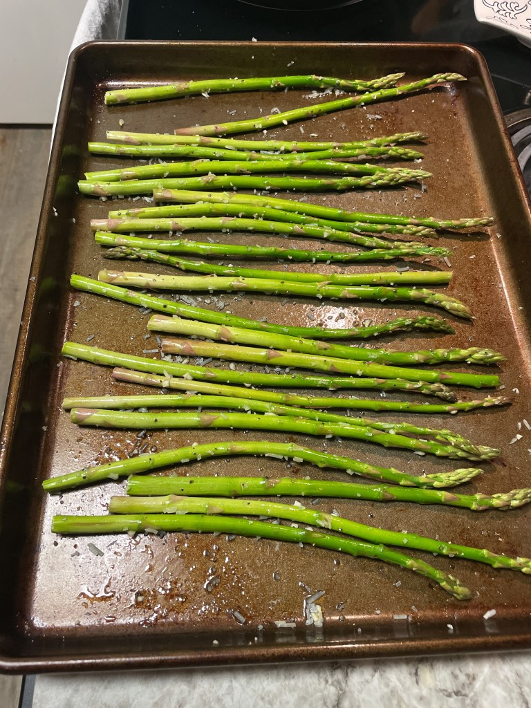 Asparagus: I trimmed the ends and spaced them out on a sheet pan. Drizzle oil on top and seasoning with salt and pepper. Add minced garlic, lemon juice and parmesan cheese. Mix with your hands and evenly distrbute over all pieces of asparagus. Spread out evenly on the sheet pan.
