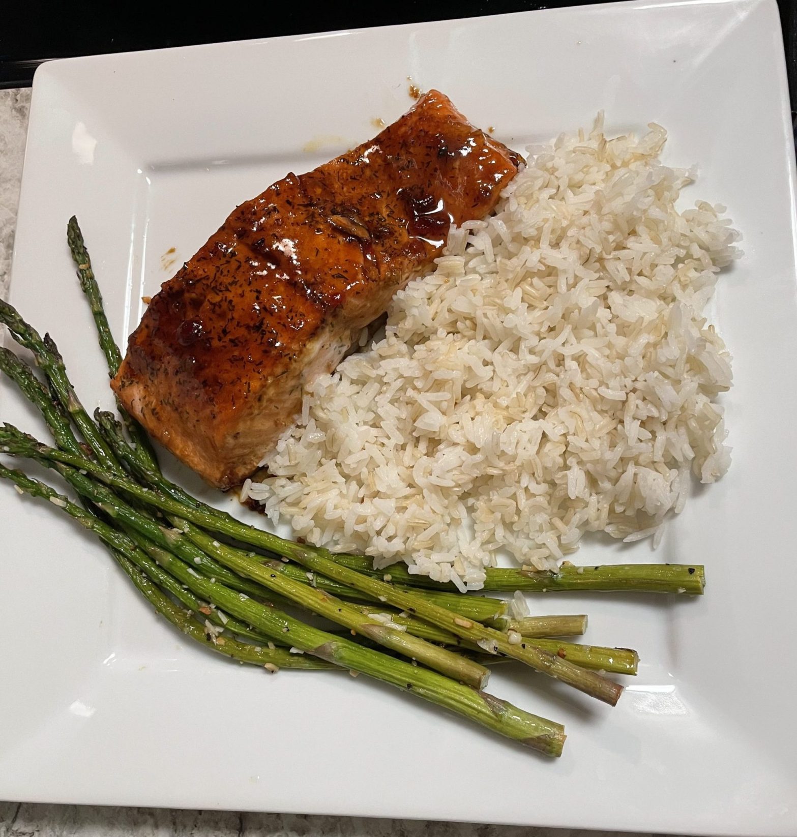 After adding the glaze, place the cast iron in the oven for an additional 2-3 minutes. When time is up take the salmon and asparagus out. Flip the salmon filet’s back over and add any additional glaze if you please! Dish out the rice, asparagus and salmon and enjoy!