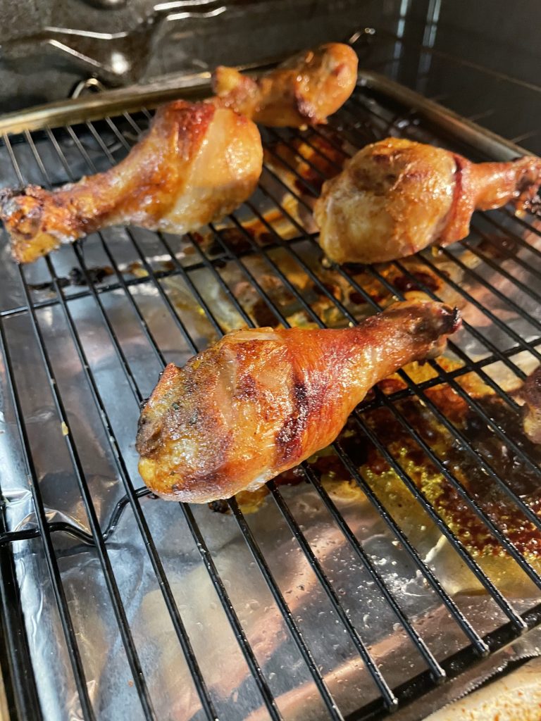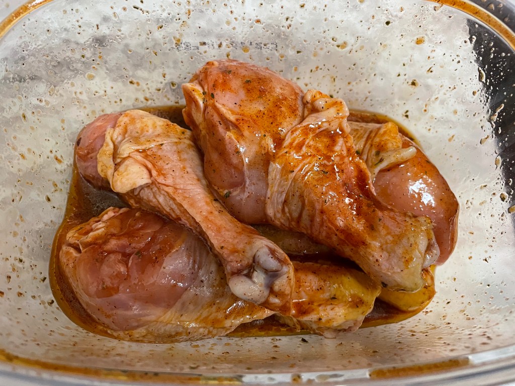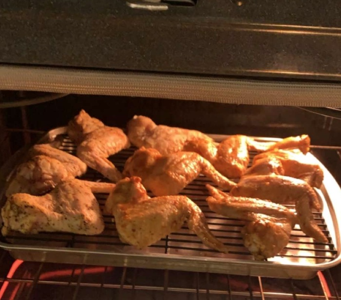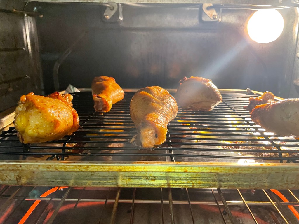 I set the oven to 425 for chicken legs and thighs and cook about 40-45 minutes, pending on the size of them. I will check them about halfway through to see if they need to be flipped or rotated. For wings, I set the oven to 450 and will cook them for 30 minutes. I then flip the wings and cook for an additional 20-30 minutes, again depending on the size. Lastly, for tenderloins, I set the oven to 375 and cook for about 25-30 minutes. Again checking halfway to flip or rotate them.