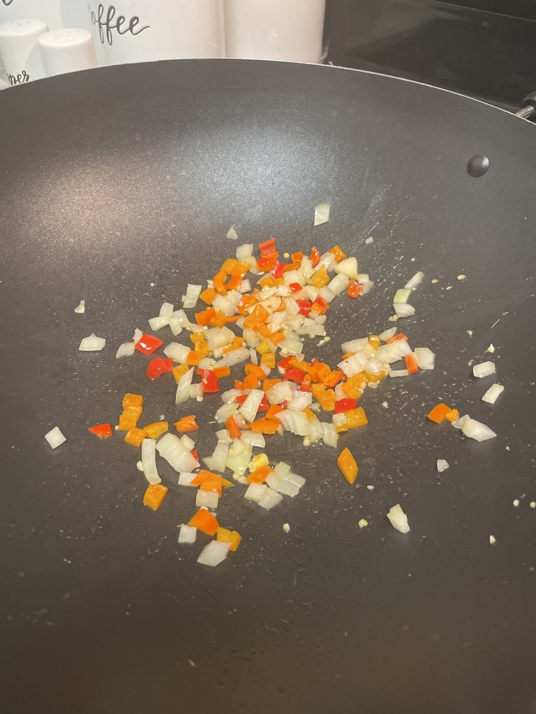 1. Chop veggies and garlic. I use onions and peppers. Sometimes I will add carrots, celery or cabbage. It all depends on what veggies I have.