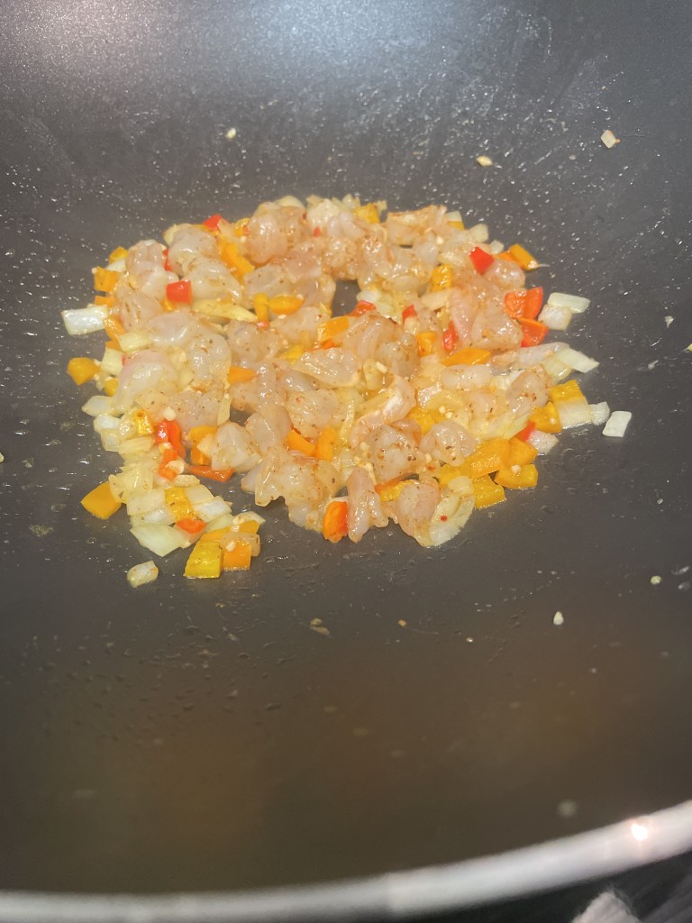 5. Add the chopped veggies, garlic and protein to the wok. Season with salt and pepper and your favorite seasonings while sautéing. I have added chipotle, jerk, old bay, chili and adobe seasonings. All depends on my protein and what my mood that day is!