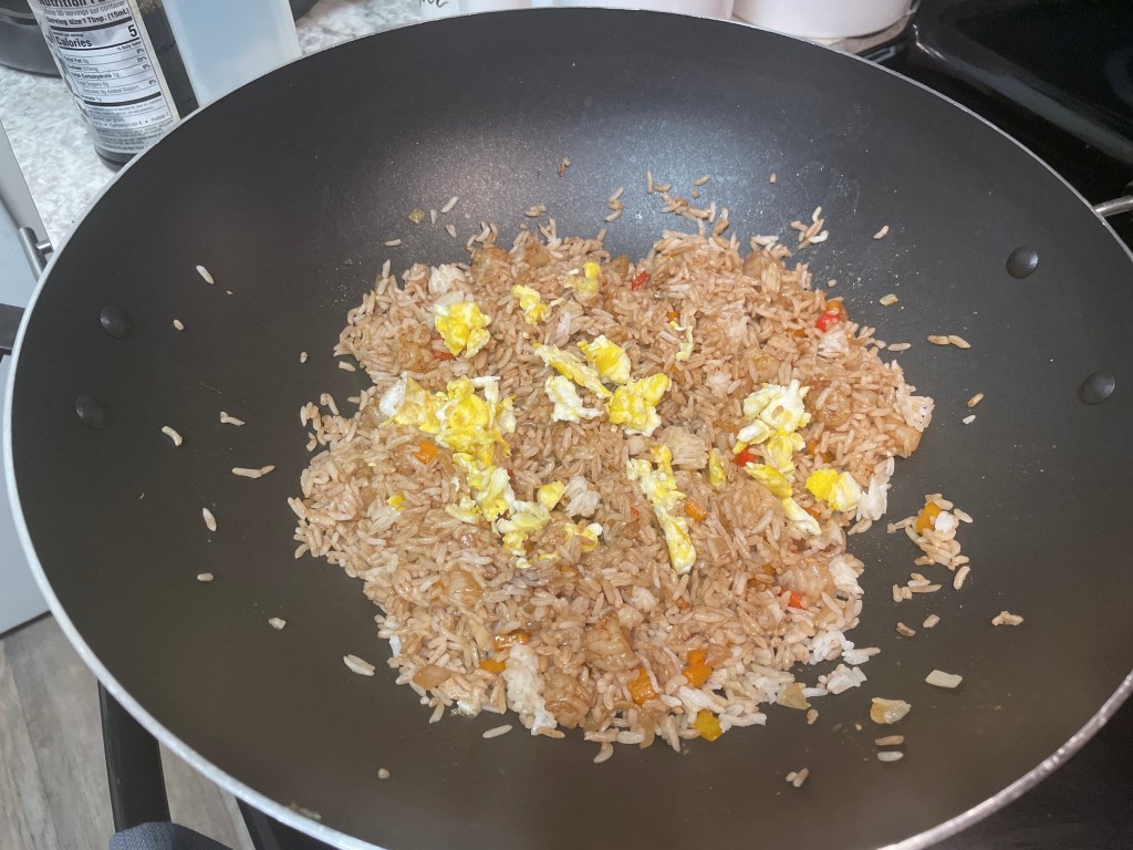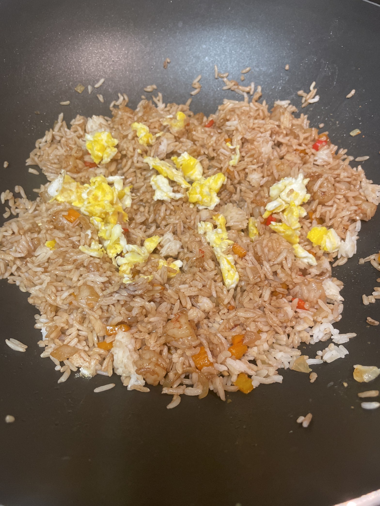 6. Once your veggies and protein have cooked add rice to the wok and combine. Add soy sauce and continue to stir. After a couple minutes, add the scramble egg back in and stir.