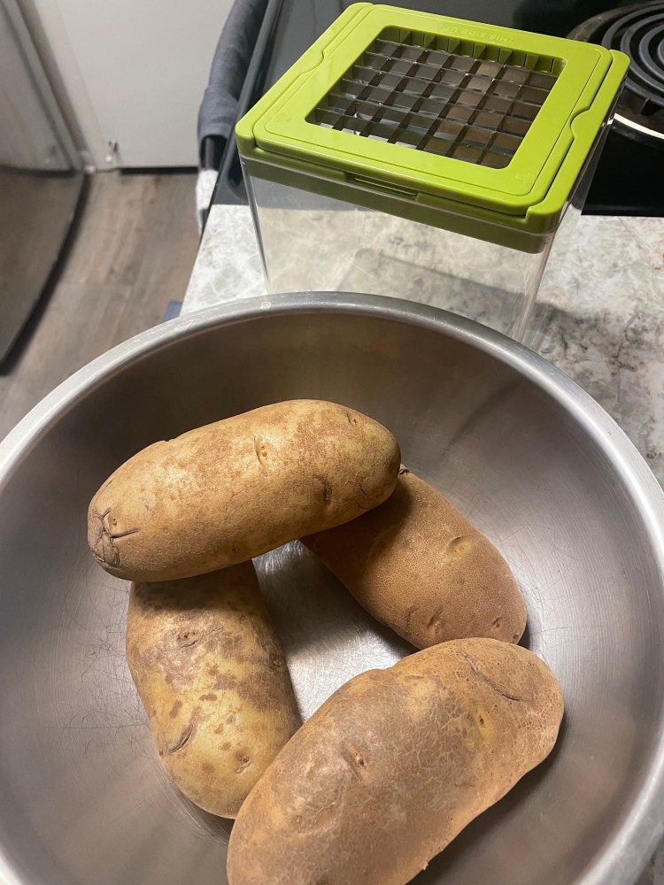 Start by cleaning and rinsing off the potatoes. I have a cutter that helps to make the perfect fresh cut fry! After the potatoes are rinsed and cut, soak them in water for about an hour or so. This helps to remove the some starch from the potato and gives a good crunch. Lay the fries out and allow them to dry off.