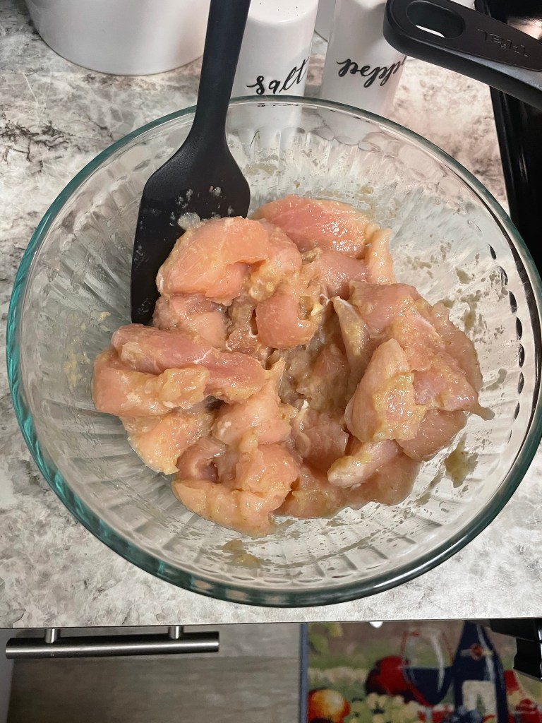 I came across this kit while shopping at Walmart so I thought I would give it a try. It came with a garlic-ginger paste, Korean BBQ sauce and sesame seeds for topping. You could use beef, pork or chicken. So I decided to give chicken a go! I had some chicken tenderloins in the freezer, and I took them out the night before to thaw out.