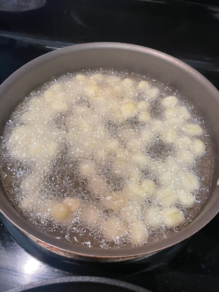 As I said this recipe is super easy. Heat about a half inch of oil in a pan on medium high heat. Then drop the gnocchi in the heated oil. Take a metal spatula or tongs to make sure the gnocchi are separated and do not stick together as they fry. Keep them frying until they get to be a nice golden brown. Remove them to a paper towel lined plate and salt them immediately.