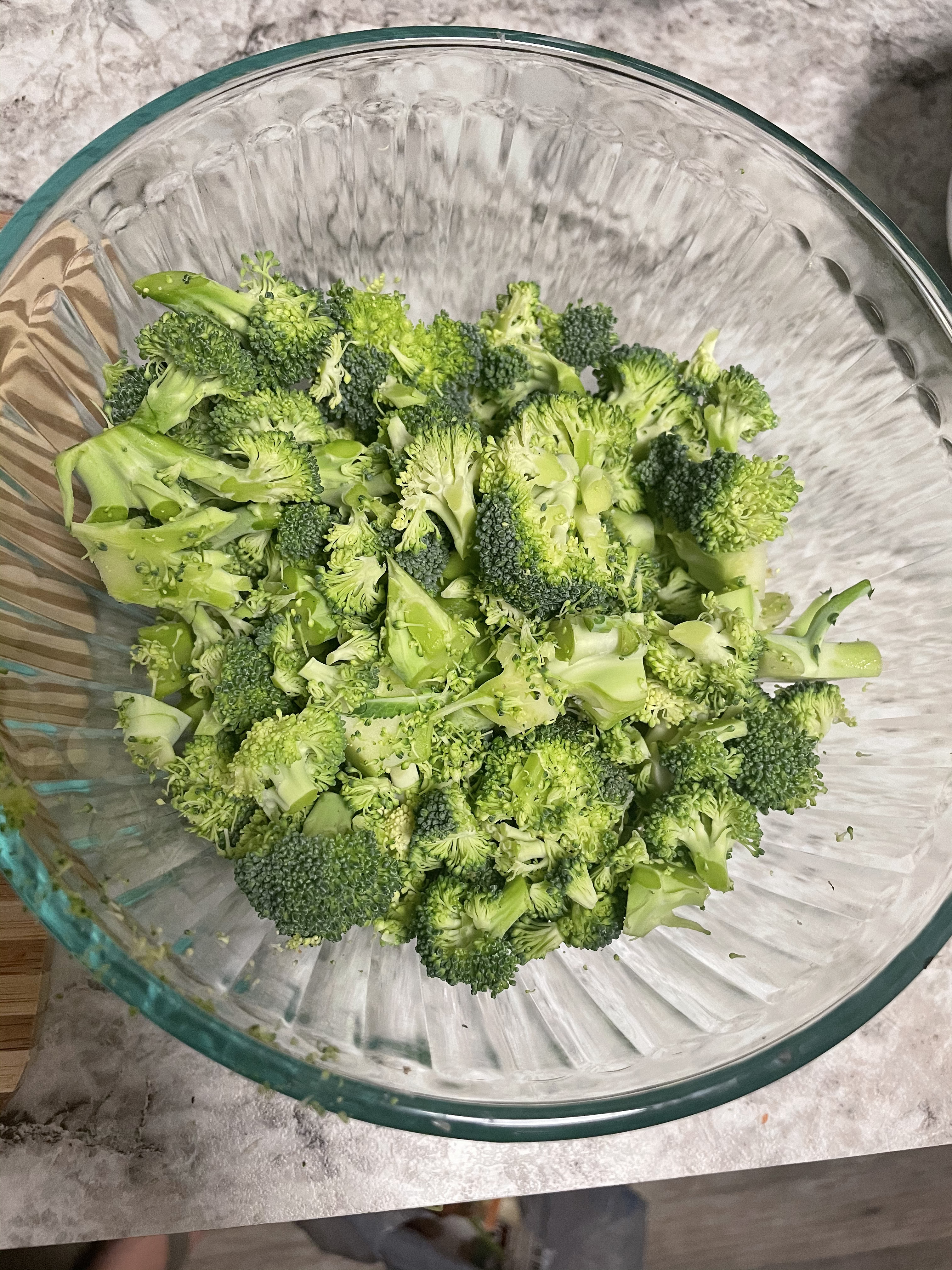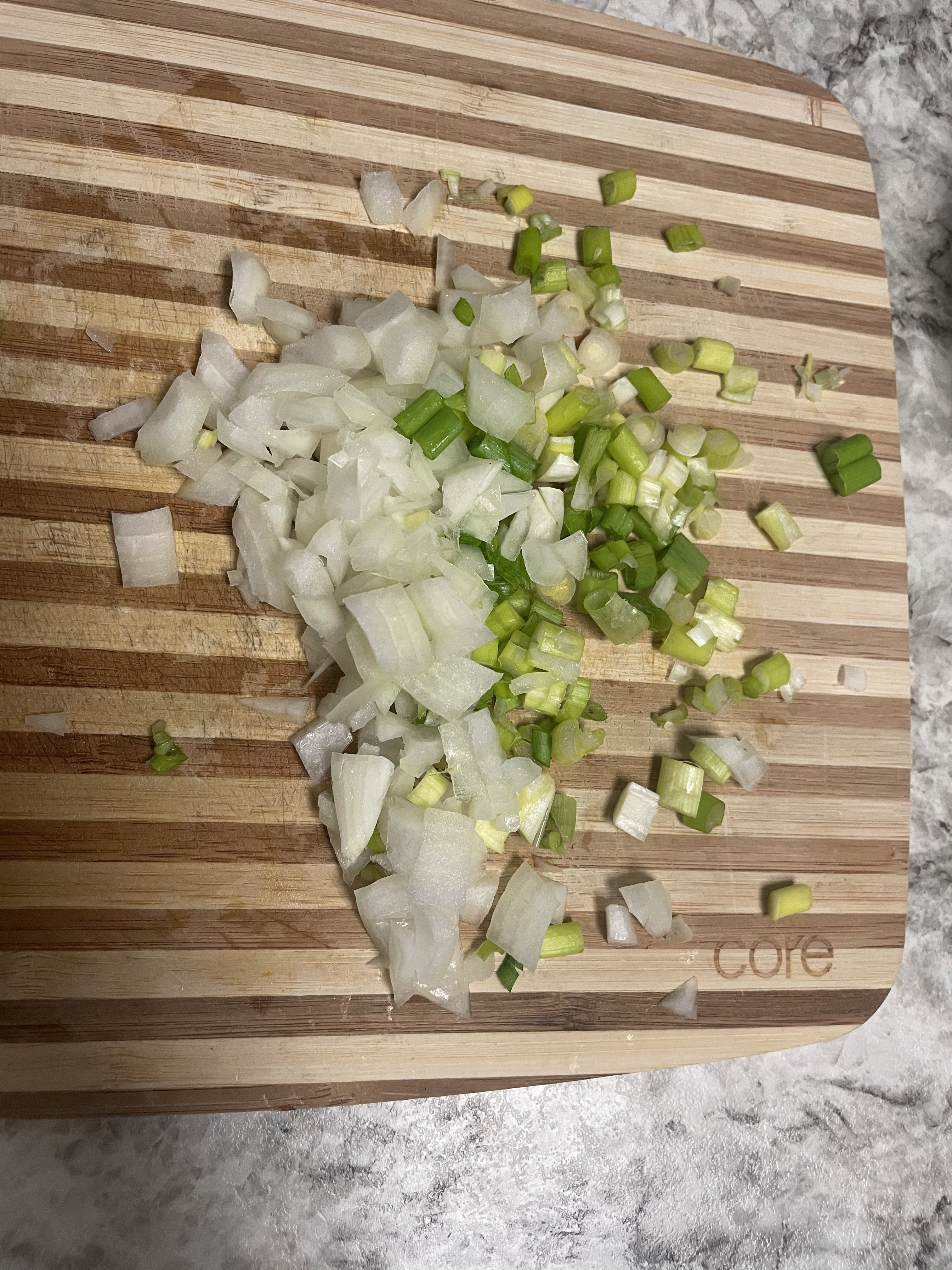 I started by chopping my head of broccoli. It was about 1.5-2 cups chopped and I placed it in a bowl. I then chopped onions; a mixture of green and yellow because that is what I had. I then chopped 1 stalk of celery and 1 carrot. I placed the onions, celery and carrot in a separate bowl.