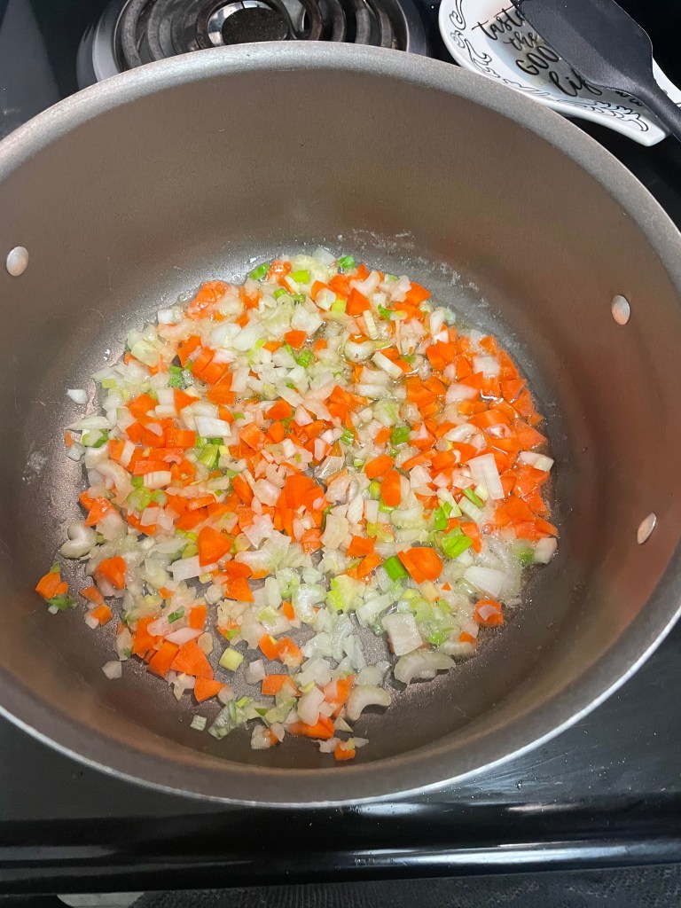 In my stock pot I heated some bacon grease (use oil if you don’t have bacon grease) and about 1/2 tbsp of butter on medium-high heat. I then add the onions, celery and carrots. I season with a bit of salt and white pepper. Sauté about 2-3 minutes. Then add the 3 tbsp. of flour and stir until well combined.