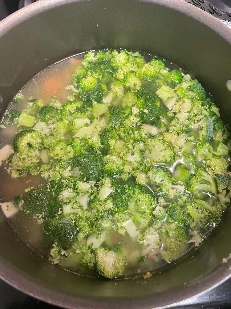 Once you have the flour mixed in add the broccoli, chicken broth and water. You do not want too much liquid if you are looking to make a creamier/thicker soup. Stir together and season with more salt, white pepper, black pepper, ground mustard and garlic powder.