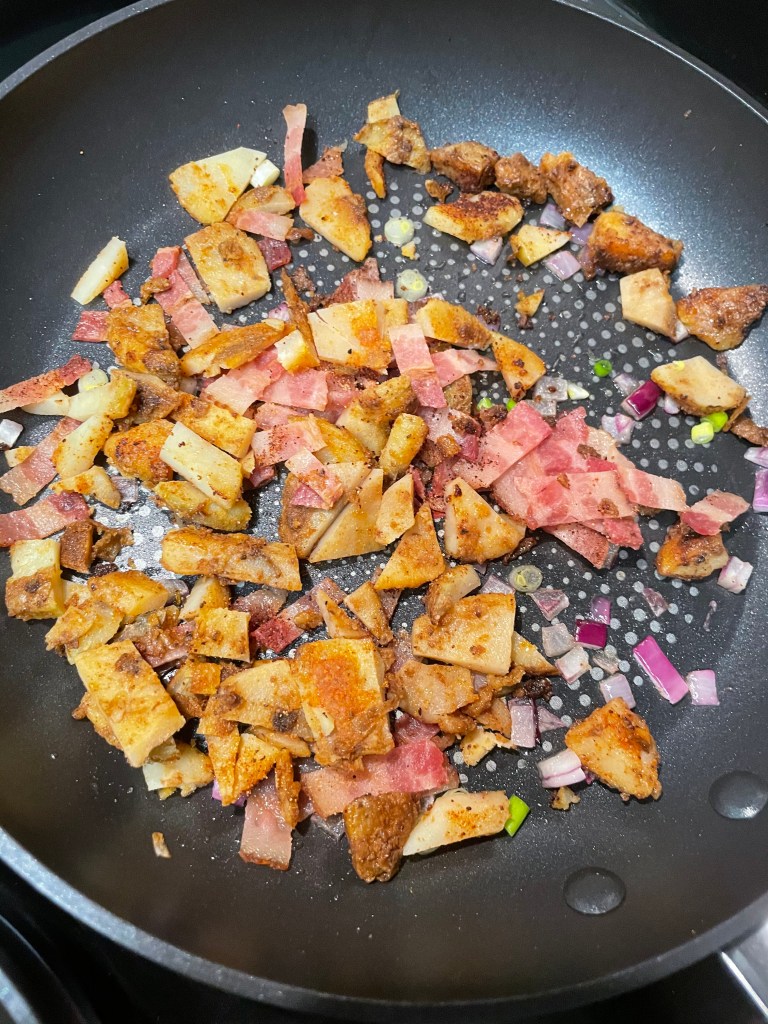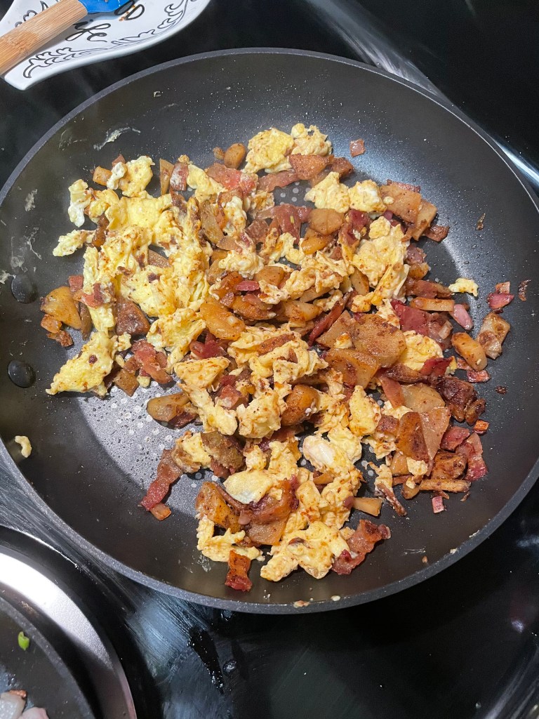 I use some of the same items from my breakfast tacos for breakfast burritos. But I use bigger tortilla wraps. Again I find these at Aldis; only $1.29. If I do not have potatoes, I use the diced potatoes I keep in the freezer. I actually had some leftover breakfast potatoes that I used. I chop bacon (sometimes sausage). Mixed the bacon, potatoes and chopped red onion in a pan with oil. After sautéing for a few minutes, I added eggs to scramble with them. I season with a bit of salt, pepper, chipotle seasoning and fresh lime juice.
