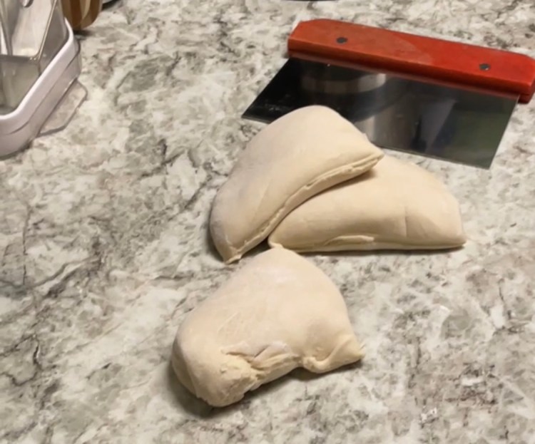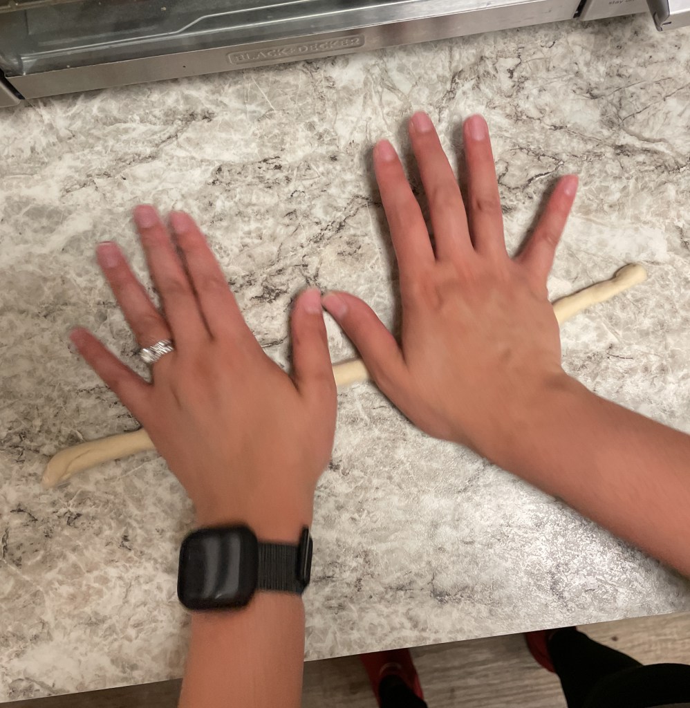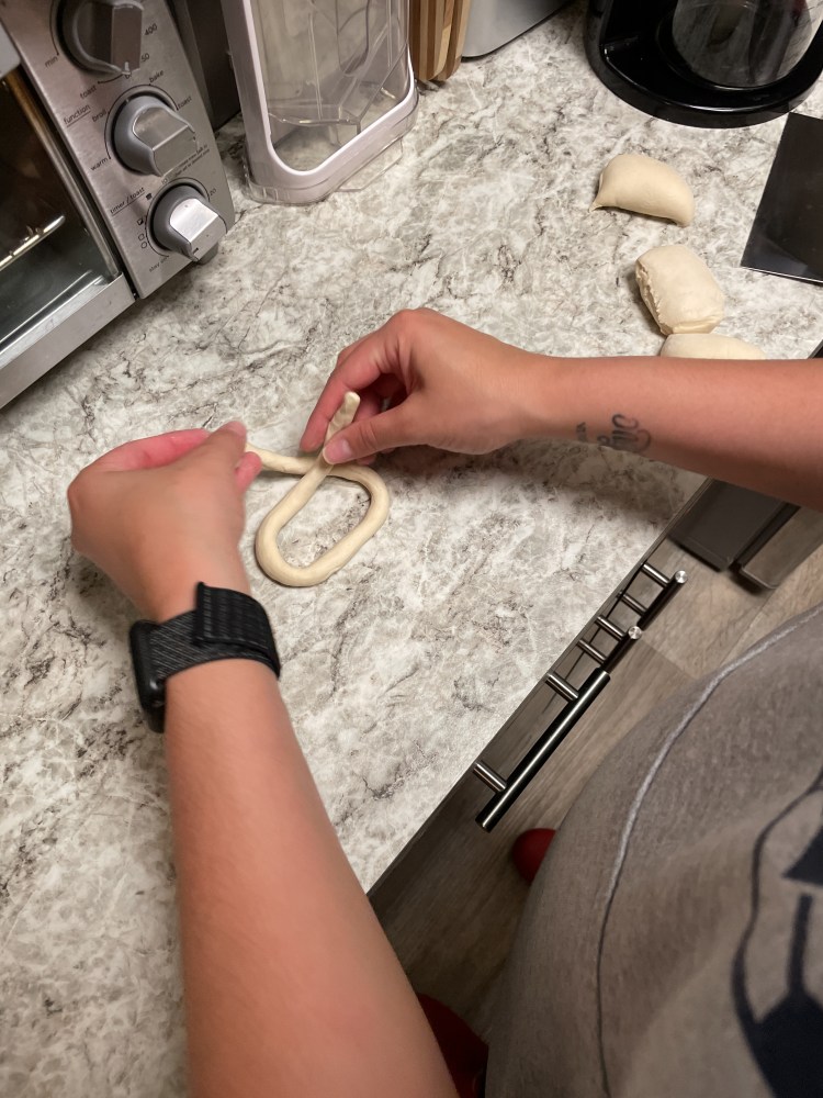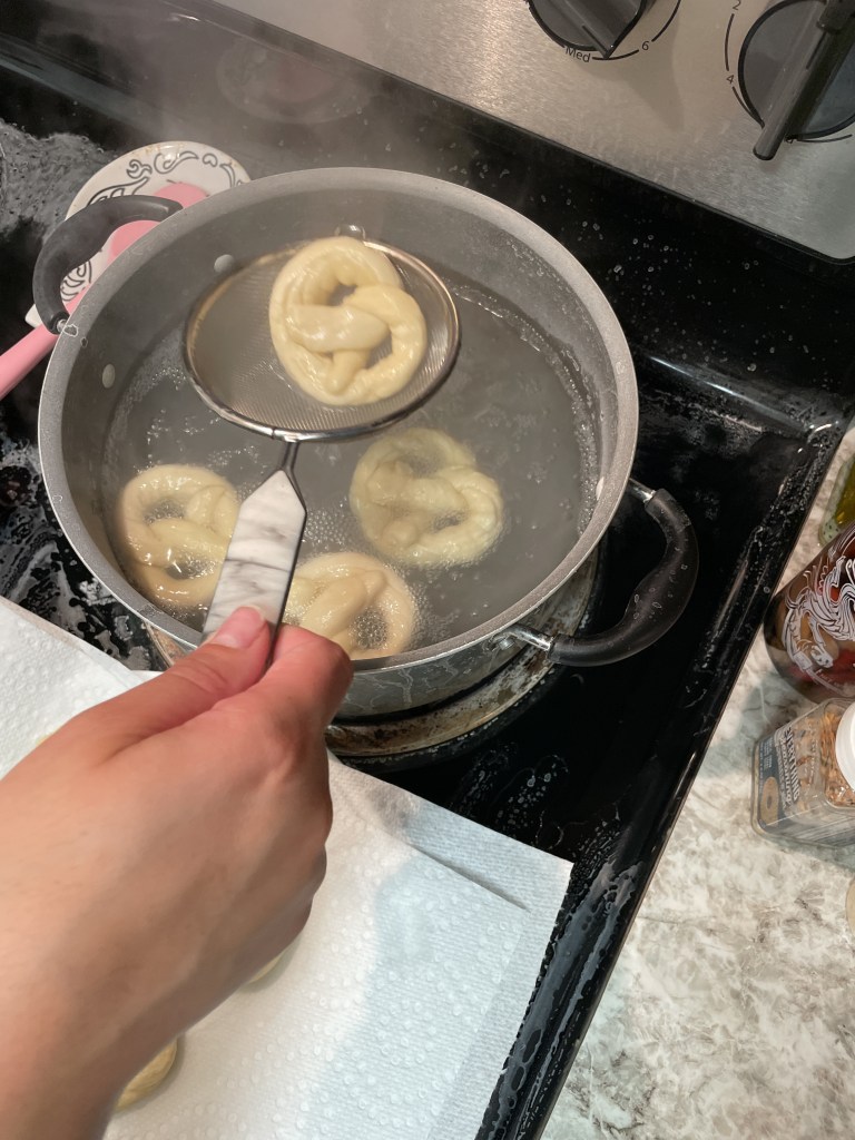 As the water is heating, I start the pretzel process by dusting the counter with a bit of flour, to keep the dough from sticking. I divided the into 4 sections, and then each section again into 4’s. I take each small section and roll them in to a long logs. Then loop, twist and press down the ends to they stay together to create my pretzel shape.