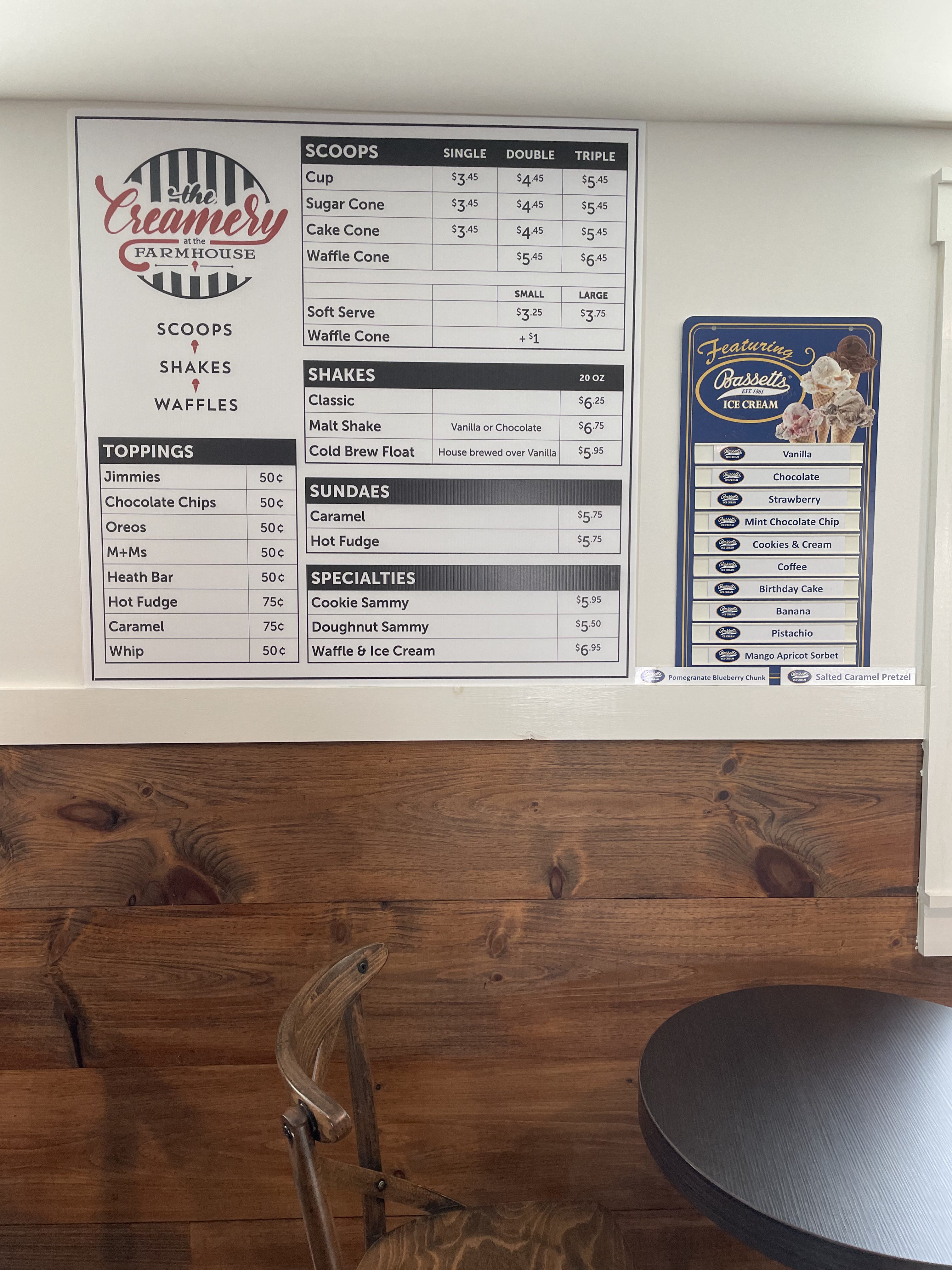 Ambiance/Atmosphere: As the Farmhouse was, the inside gives you that farm feel, with wood decor and accents. But the colors are white and black. The colors that come to mind when it comes to dairy/fresh made ice cream! The creamery has seating inside, as well as tables outside. But they have recently expanded the outside with a covered deck that is perfect for the summer nights to come!