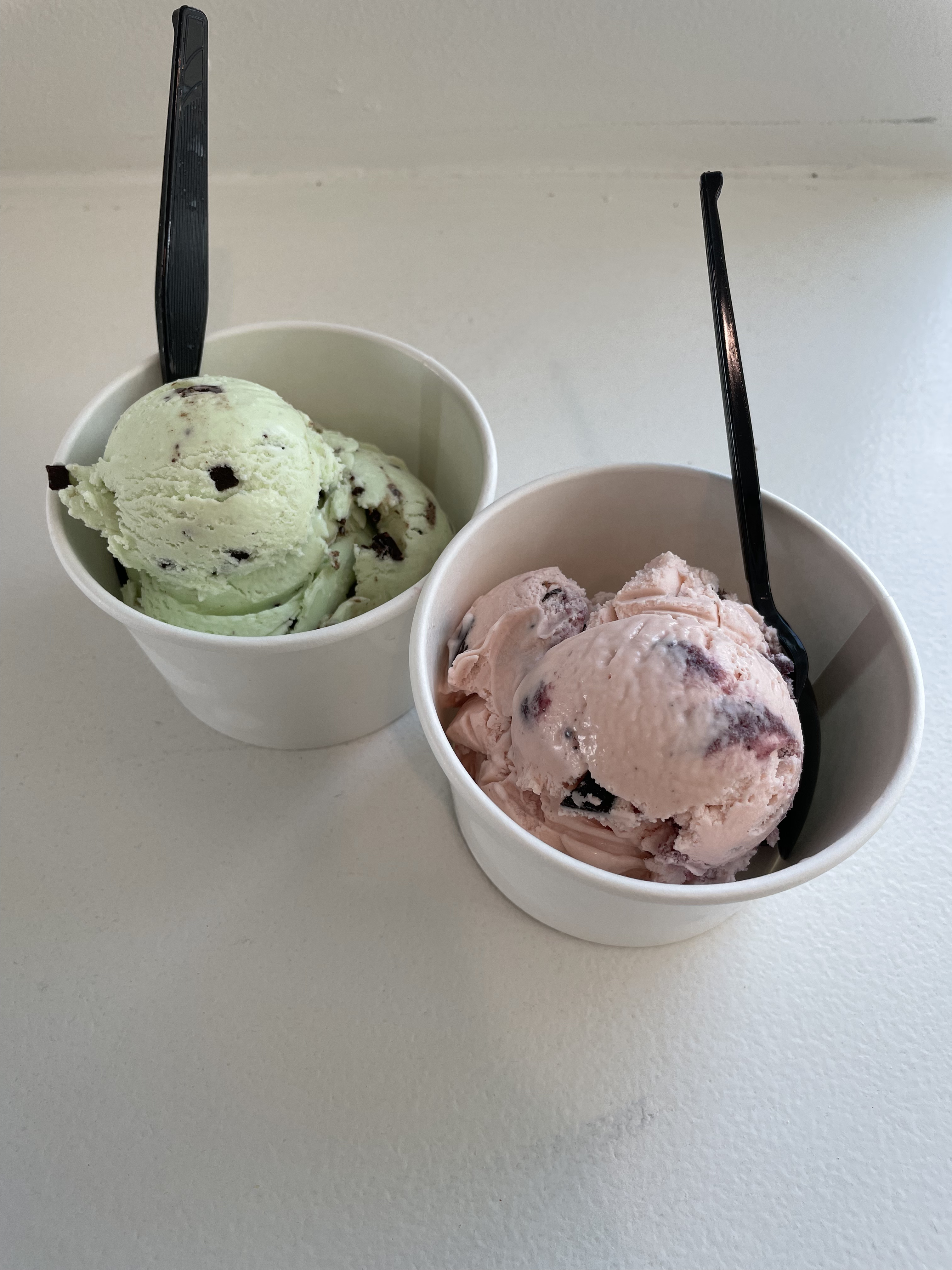 We decided on the the mint chocolate chip. Because it is a go to favorite of ours. Then we went to try something new and ordered the pomegranate blueberry chunk! It was pomegranate ice cream with pomegranate and blueberry swirls and dark chocolate chunks. Both were so delicious and creamy. Not sweet at all! The mint chocolate chip we give 8/10, would recommend. The pomegranate blueberry chunk gets a 10/10. We would definitely get again! It was creamy, tart and a hint of sweet from the chocolate.