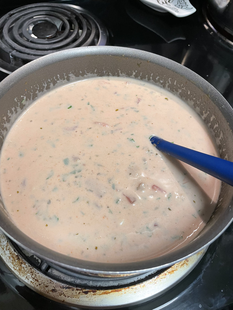 As I said, this recipe is quick and easy! Start your pasta water first. In sauce pan, combine the can of white clam sauce and dice tomatoes. Mince the garlic and add it. Allow the sauce to simmer. Slowly add the heavy cream and stir. Turn the heat down to medium-low and continue to simmer.