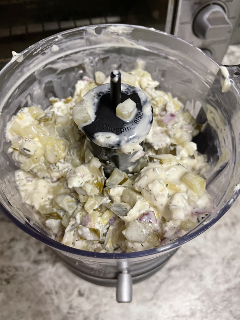 Next I added everything to the food processor. On chop, I continued to finely chop the ingredients and combined them. Lastly, I change the setting to puree and continued to mix until the dip was well combined and smooth. Refrigerate over night for best results!