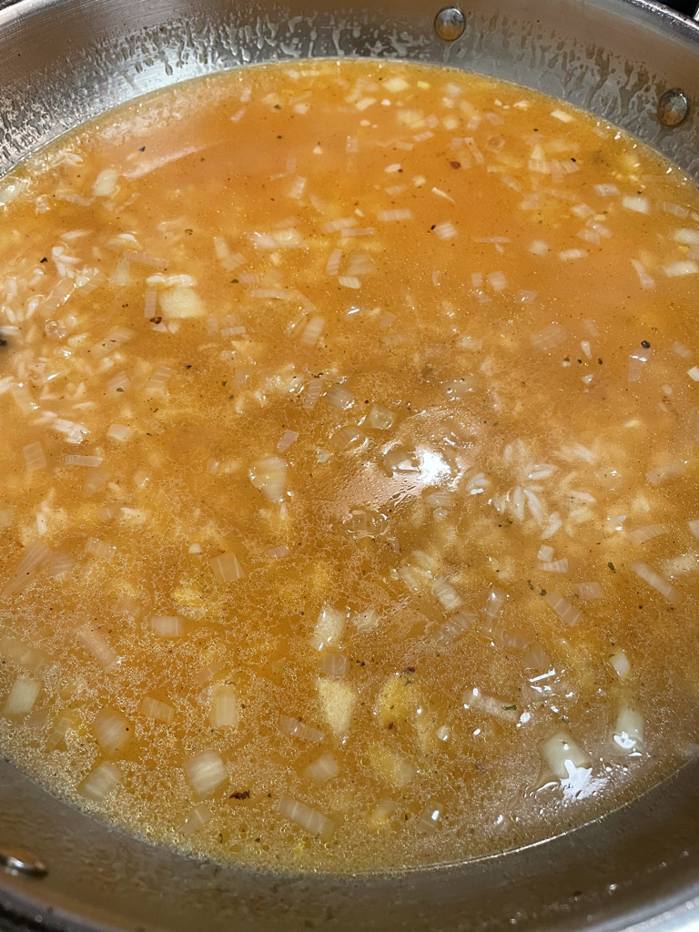 If you like rice, then I would recommend making 2 cups of rice. Use the ratio of 2 cups of broth to 1 cup of rice as well as ¼ cup of water to 1 cup of rice. So when I made this I decided to make 2 cups of rice; I used 4 cups of chicken broth (2 cups of regular chicken broth and 2 cups of a chicken tomato broth from a bouillon cube) and about ½ cup of water. If you like your rice a bit drier, then I recommend only using ¼ cup of water, as our rice turned out pretty moist.