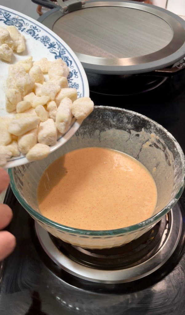 First I started making the hot honey dipping sauce. I copied Kardea Brown’s recipe for hot honey. She serves this with a pickle brine fried chicken that sounds so delicious. Since some don’t like pickles, I will have to save the recipe for another time. LOL Anyways her hot honey recipe was easy to follow. I opted to just use the microwave and bowl, rather than the sauce pan and stove. It still turned out delicious; the perfect sweet and spicy combination!