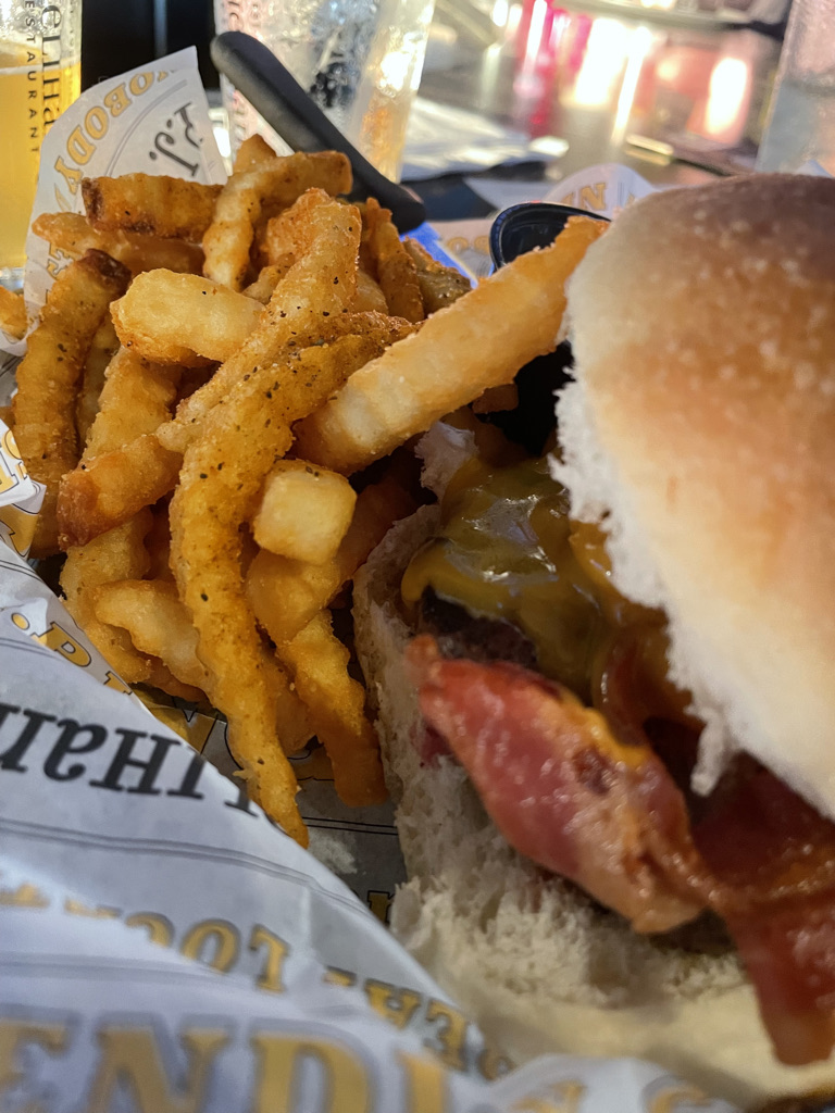Menu: As a sports bar, they have all the good grub! The appetizer list has great variety. I love the fried pickles! But this time we we started with wings. We ordered them naked with their hot-n-honey sauce on the side. They were delicious (9/10). Hot-n-honey sauce was more spicy then sweet, my homemade hot honey is better! LOL For the main course we ordered burgers. I ordered the Pjs burger with cheese, bacon and caramelized onions. It hit the spot! Almost as good as the pour house, but I didn’t like this bun as much LOL (9/10). Of course we ordered those famous fries on the side!