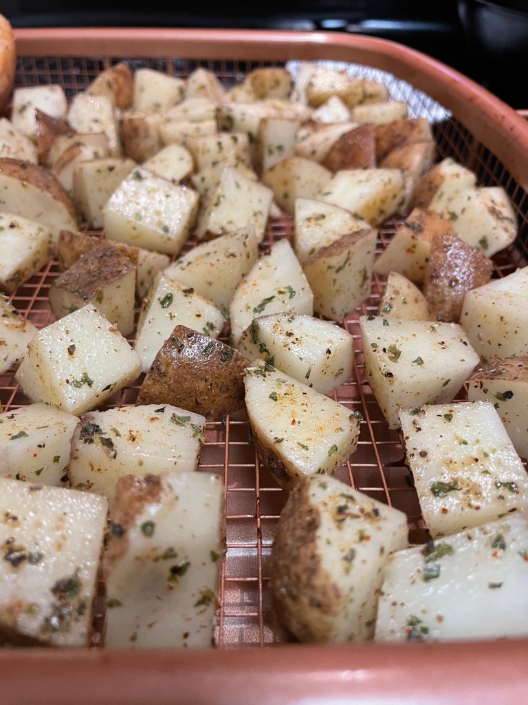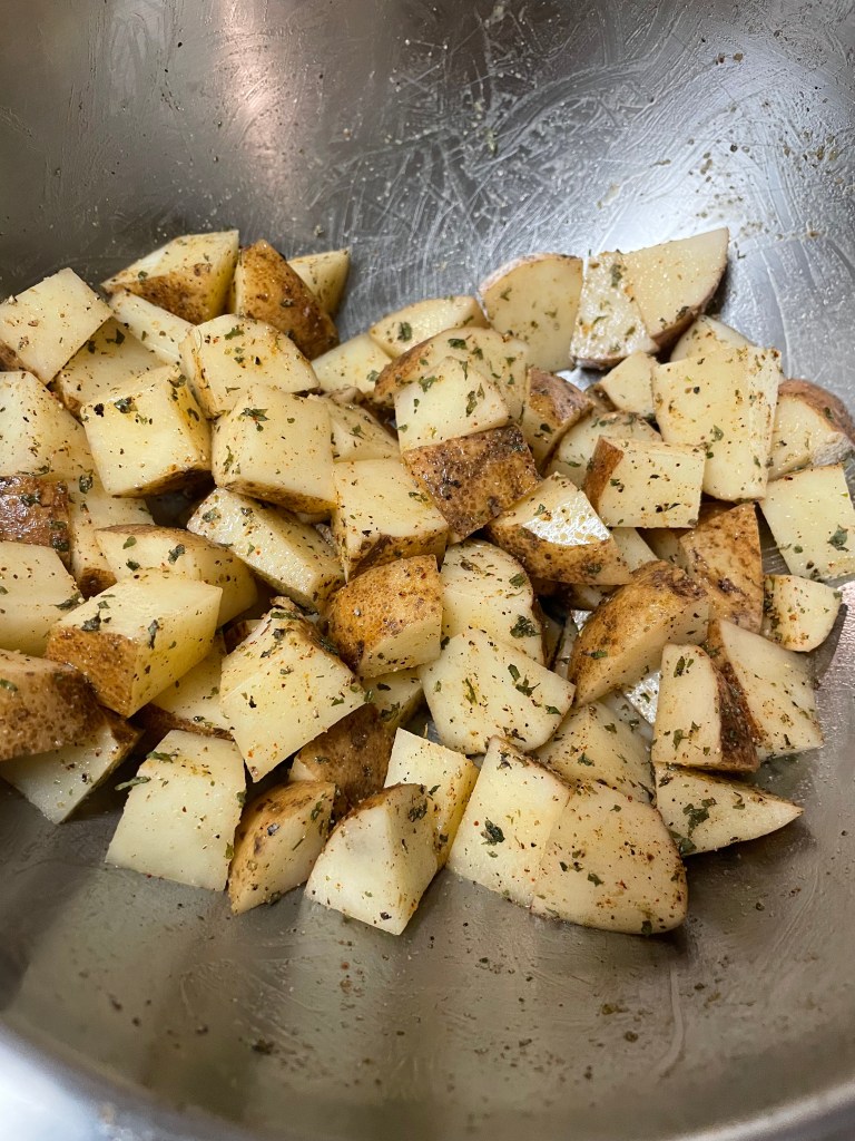 I started by preheating the oven to 425. I cubed the potatoes and then tossed them with EVOO, salt, pepper, garlic powder, chili powder, onion powder and parsley. I then place them on the pan and try to spread them out as much as possible so they are not touching. When the oven was ready heated, I put them in for about 20-25 minutes until they are golden brown.