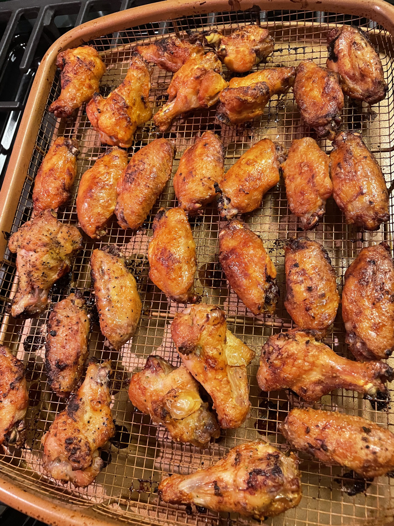 Start by preheating the oven to 450. The wings we had were already separated. But I have kept the wings whole before for this recipe and they still turn out delicious and crispy! I found some fun season packets at Walmart. There were about 25-30 wings and we seasoned them with three different packets (we like our variety). A small handful were seasoned with lemon-pepper, a small handful for me were seasoned with garlic-parmesan and the rest we seasoned with classic buffalo! Once seasoned, I spread them out on the copper pan as evenly as possible, trying not to let them touch so they can cook/crisp all around. Popped them in the heated oven for about 30 minutes. Next I take them out and give them a flip and pop them back in for another 20-30 minutes to more of a crisp on the outside. I prefer wings naked with any sauce on the side. This way they stay crispy and the sauce doesn’t make them messy and soggy. Also lets you control the amount of sauce/mess you want.