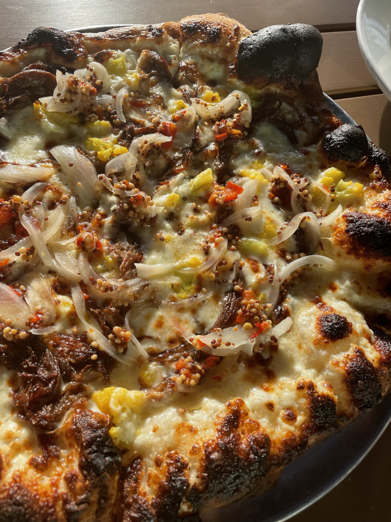 Menu: They don’t have a huge menu, but good food to pick from. On their appetizer list, they had pork belly, so of course I had to order it! Smoked pork belly bites. They were served with a Carolina mustard that paired so well with them (10/10). I even ate the lettuce on the plate with the mustard LOL. I had all intentions of just ordering some appetizers because they all sounded good, but then our server told us about the special pizza. A short rib pizza with alfredo sauce, onions and roasted cauliflower. This was a delicious combination (10/10). I definitely didn’t need the whole pizza, but I was not upset I ordered it nor that I had leftovers to take home.