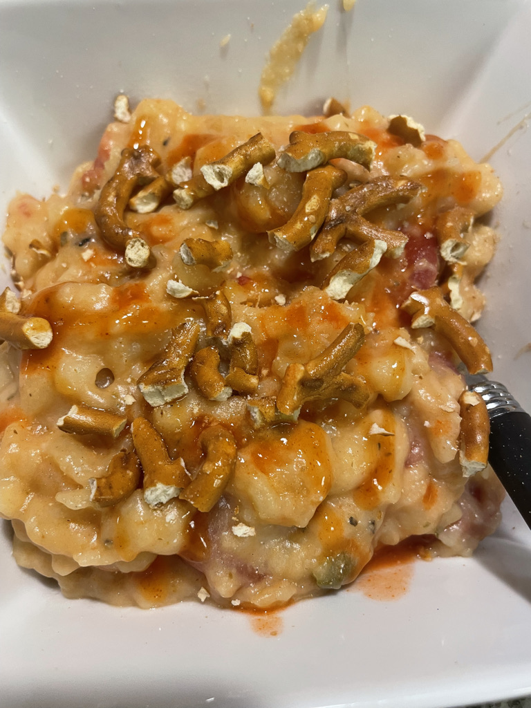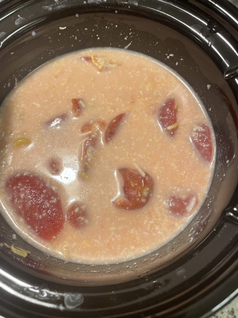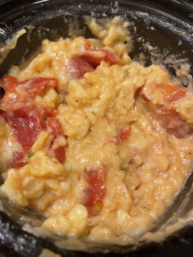 I decided to make it a mac and cheese with stewed tomatoes. I used my small dip crock pot (I don’t recommend the small one! It became too full, and stuck together too much). I added the 16 oz. can of stewed tomatoes about ¼ cup of water, 3/4 cup of milk, 2 cups of uncooked macaroni. Then I added about 2 tbsp. of butter and cheese; a mixture of Colby jack and mozzarella, again not measuring cheese. I then seasoned with salt, white pepper, oregano and ground mustard. I gave it another stir to combine it all together. I turned it on high. It was in there cooking for about 3-3.5 hours.