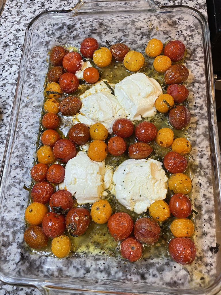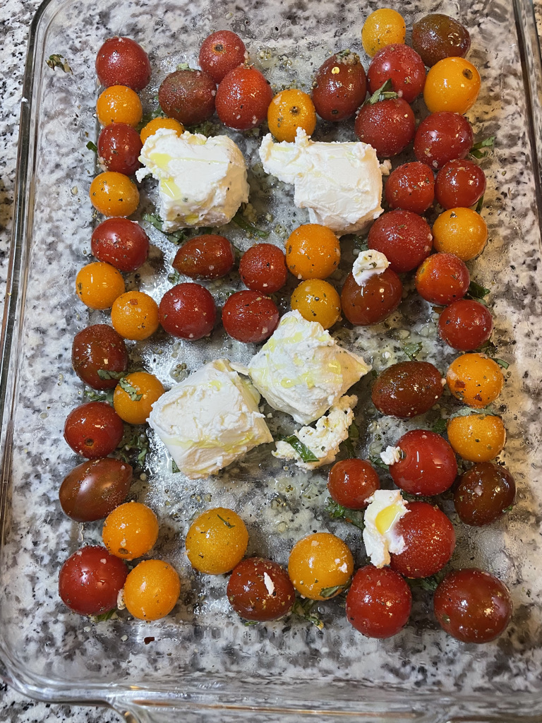 I cooked off one pound of pasta to just al dente. I baked the tomatoes and cheese for about 25-30 minutes, until the tomatoes were soft. When I removed the glass baking dish I stirred together the cheese and tomatoes, creating a cheesy sauce. Then I added in the pasta and a bit of pasta water until it was all well combined.