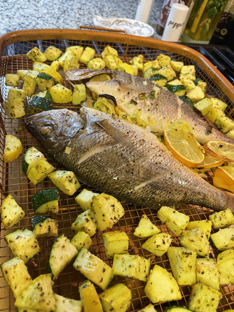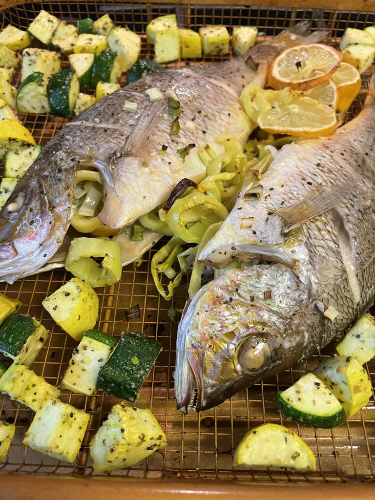 I then baked the fish for about 30 minutes. With about 10-15 minutes remaining I roasted some zucchini with it as well. I wanted to make sure that I did not overcook or dry the fish out. Which was a success because it was still very juicy and flaky, but not dry at all. I forgot to finish the fish with a quick broil to crisp the skin, but really that is all that was missing. I will made a mental note to do that next time!