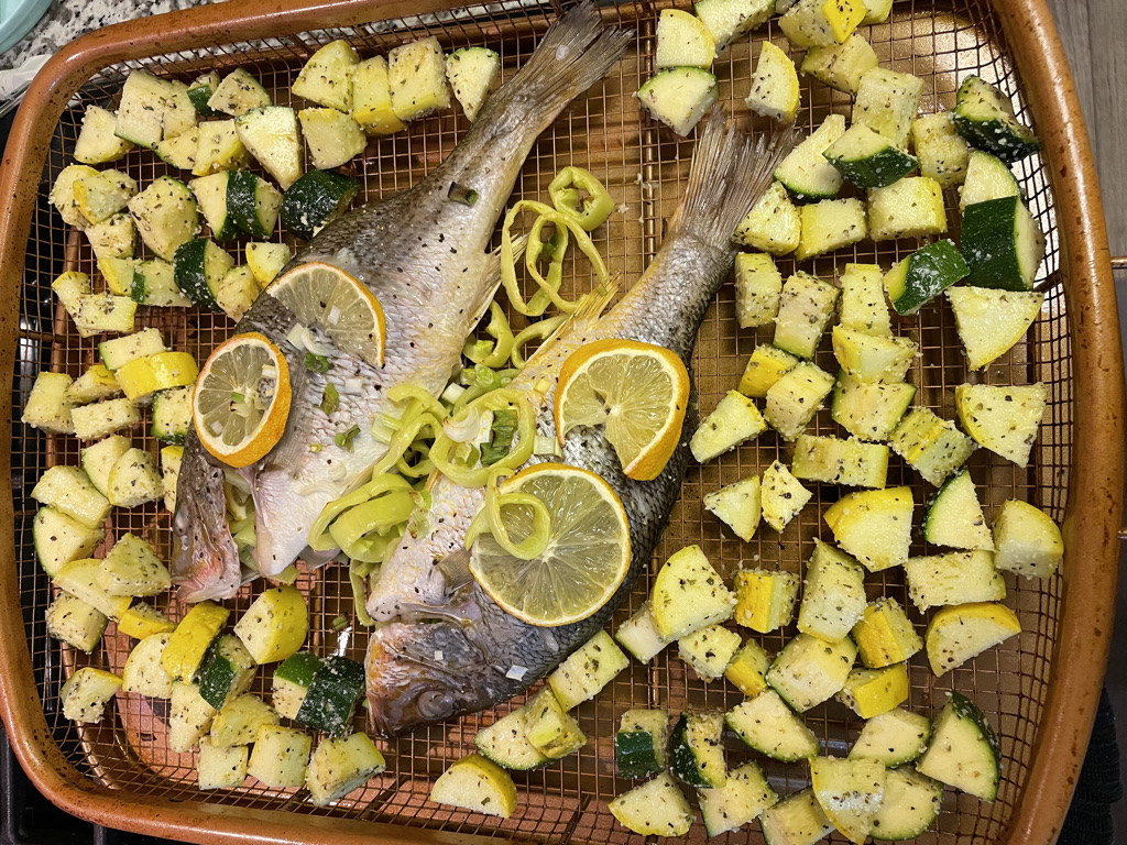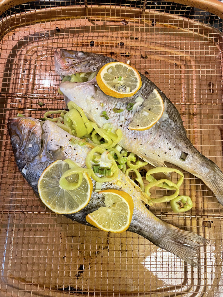 I started by preheating the oven to 400 degrees. I dried the fish with a paper towel to remove excess water. I cut slits into the fish on each side. Next I seasoned with salt and pepper on both sides and inside. I chopped some green onions and banana peppers as well as lemon slices (what I had in my kitchen LOL). I then stuffed the fish with all three and topped the fish with the rest.