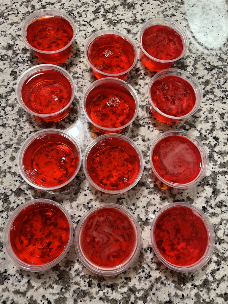 This time around, I was going for a strawberry-lemonade vibe. I mixed strawberry Jell-O with a citrus rum. My cold cup was about ¾ cup of rum and ¼ cup of water. Because I did not want them too lethal this time around. Mix well and pour into cups! Refrigerate them at least overnight and enjoy!