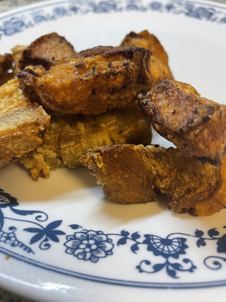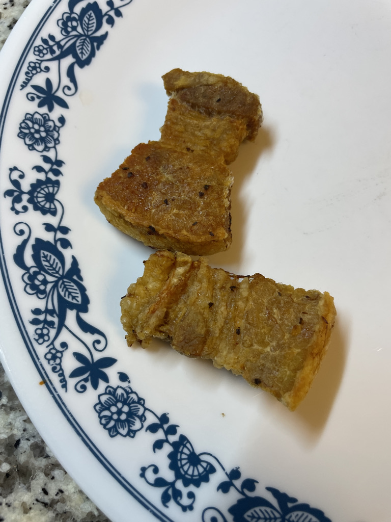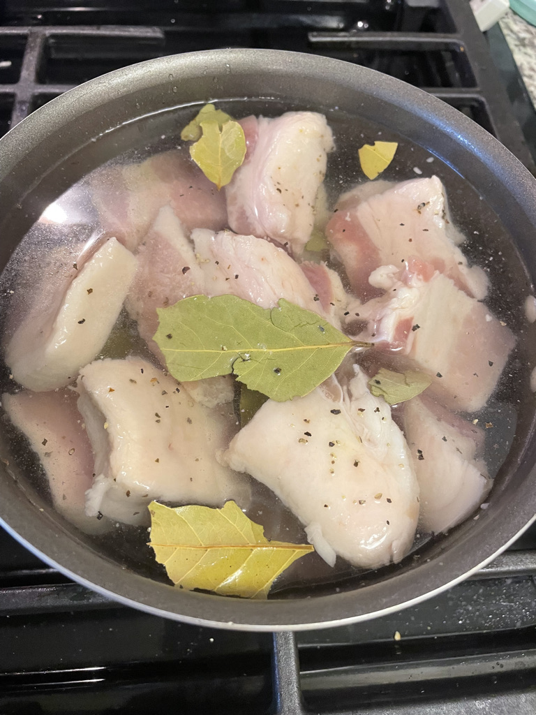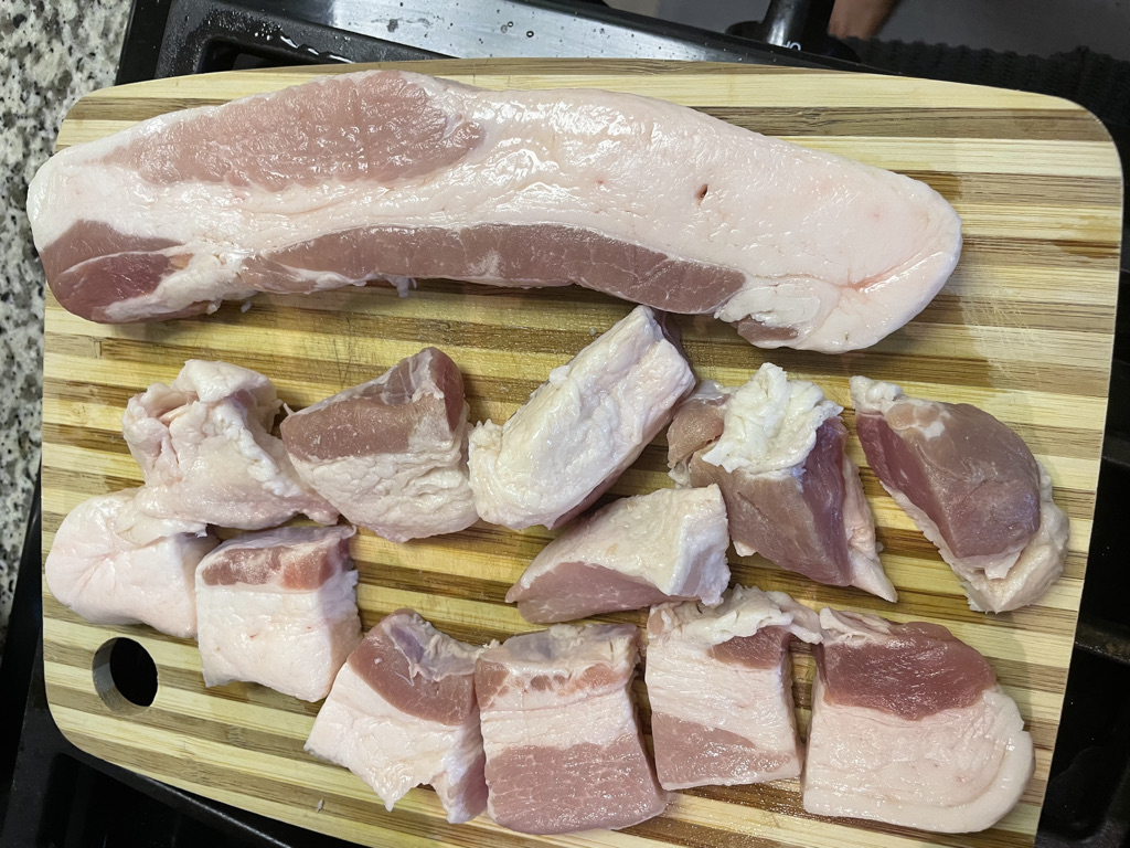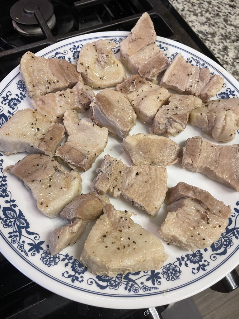 I decided to try and make more own crispy pork belly and see if it can be as good as my dad’s. I started by cutting my slices of pork belly into chunks. I seasoned them with salt and pepper. Then placed in them in a pot with water and bay leaves. I brought the pot to a boil and continued to boil the bell for about 30 minutes.