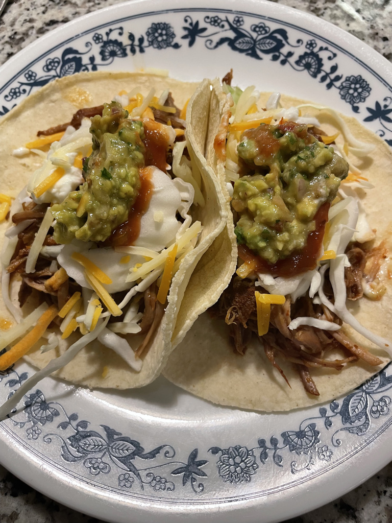 All that was left to do was to get the topping in order. I had cut slaw for added crunch, salsa, sour cream and cheese. Then also made some gauc. I just used dry cut cabbage for the slaw since the pork was so juicy I did not want a really runny taco. Everything paired together so well and it was a great taco night with some homemade tortilla chips as well!