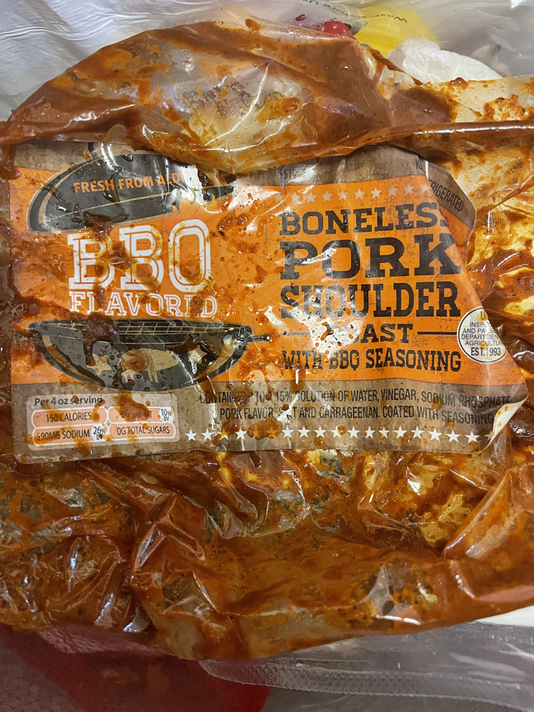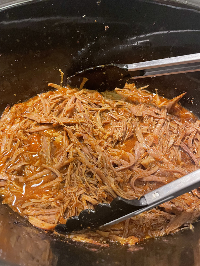 I bought this hunk of pork shoulder from Aldi’s, and its great already seasoned. I added about ¼ cup of water to the bottom of the crock pot and then place the pork inside. I added a bit more BBQ sauce and then turned it on high for about 4 hours. I then used my hand mixer to pull apart the pork. I like to add water before cooking so the pork doesn’t stick to the bottom and creates a good broth/juice for the pulled pork to sit in.