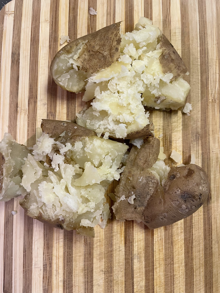 Similar to the classic breakfast potatoes, I start by boiling the potatoes until they are fork tender. In a sauce pan I heated about 3-4 inches of oil on medium-high. When the potatoes were fork tender, I removed them from the water and let the cool/dry a bit. I think took a spoon and smashed them (not letting them completely fall apart). Next, I seasoned with them with salt, black pepper, white pepper, garlic powder, onion powder and paprika.