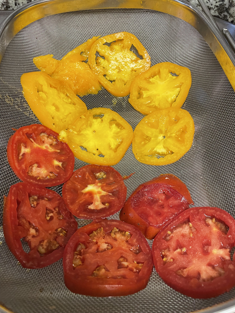 First I preheated the oven to 375. Next I sliced my tomatoes and set them in a strainer to drain out excess water. I also salted them.  I greased a pie pan and used pre-made pie crust and covered the dish. I took some melted butter and brushed the crust. I moved my sliced tomatoes to a paper towel lined plate to remove more excess water.