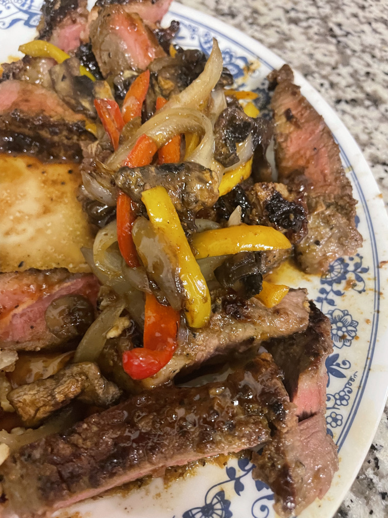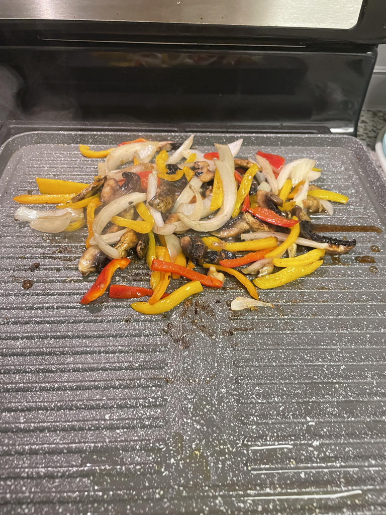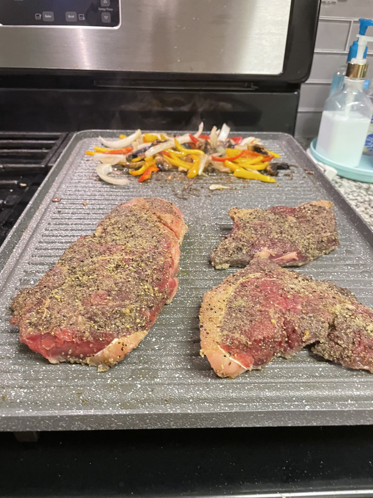 I took it out of its packed and seasoned it with salt and steak rub. I took it out of the fridge about 1 hr. before I was ready to cook it. I used my grill pan I got from Costco and heated both burners with a bit of oil. Next I sliced onions, peppers and mushrooms. I sautéed the veggies on one burner and then added the steaks on the other burners. As they were cooking I added to Korean BBQ sauce as well as butter for extra flavor.