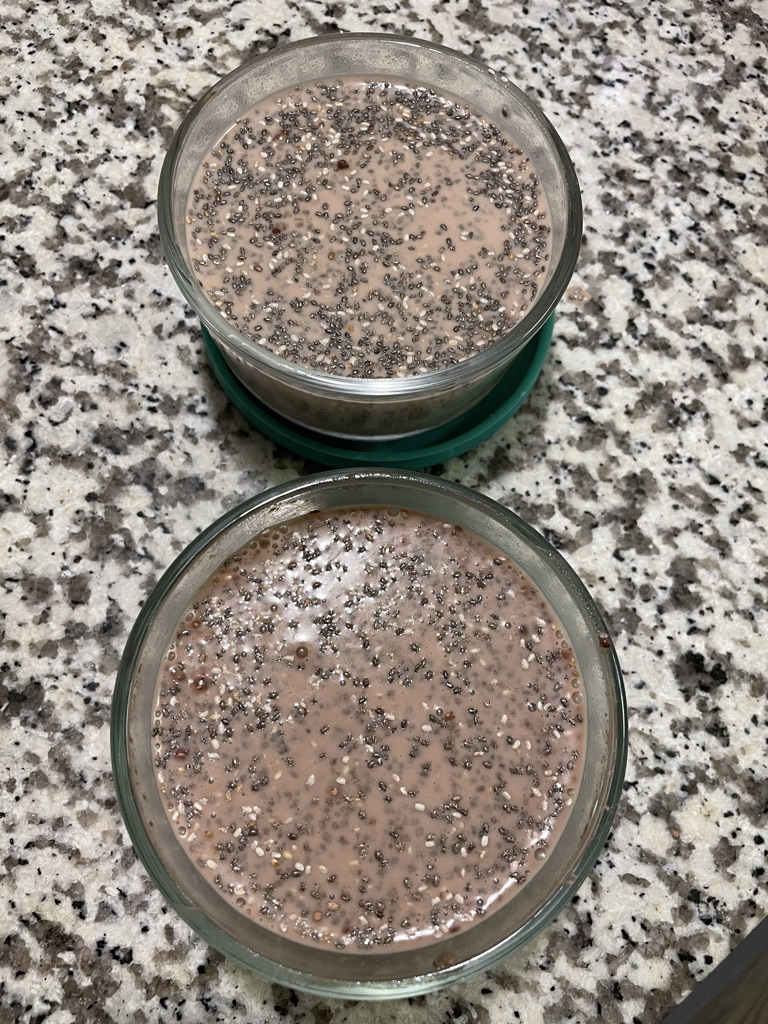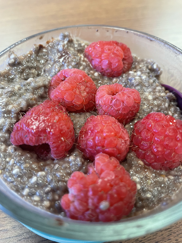 You start with a ½ cup of your milk of choice. I used oat milk, it has become my favorite! Then I added ¼ cup of chia seeds, 1 tbsp. cocoa powder, ½ tsp vanilla and 1 tbsp. honey and mixed until well combined. I refrigerated overnight and then enjoyed with some fresh raspberries! In another dish I used only ½ tbsp. of cocoa powder with ½ tbsp. of peanut butter powder. It was a delicious chocolate peanut butter combination.