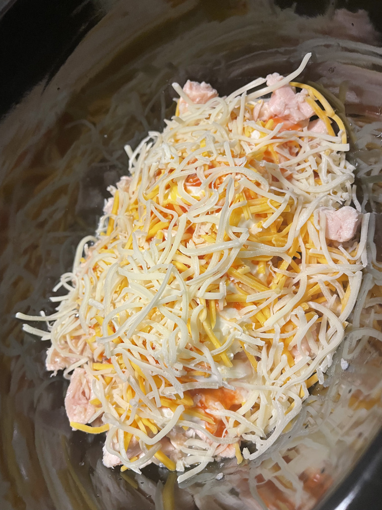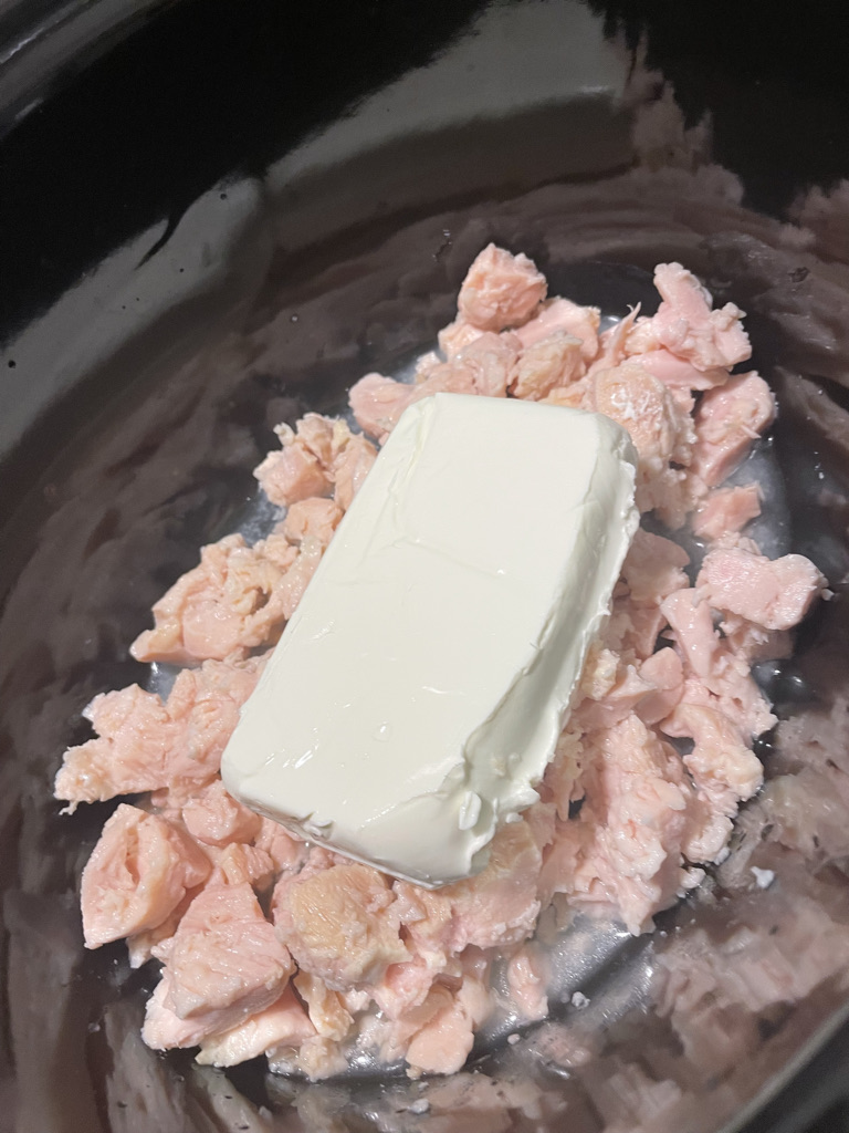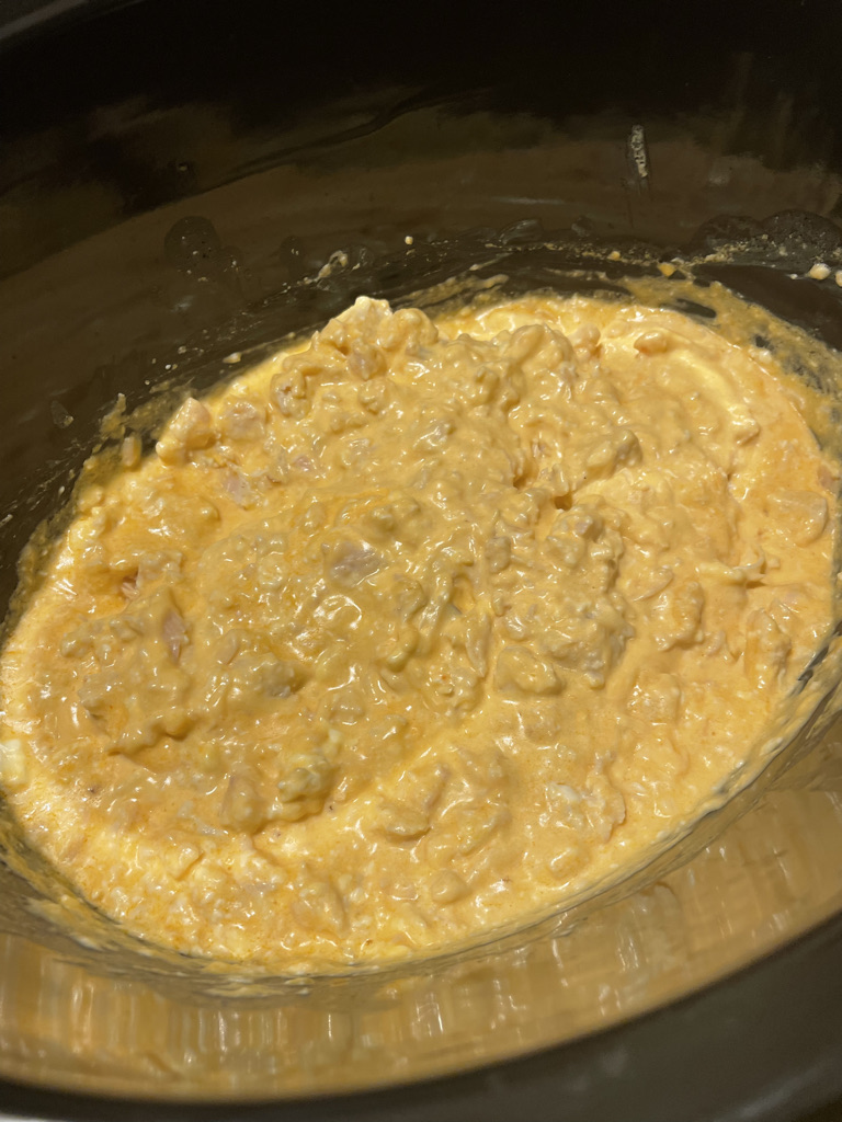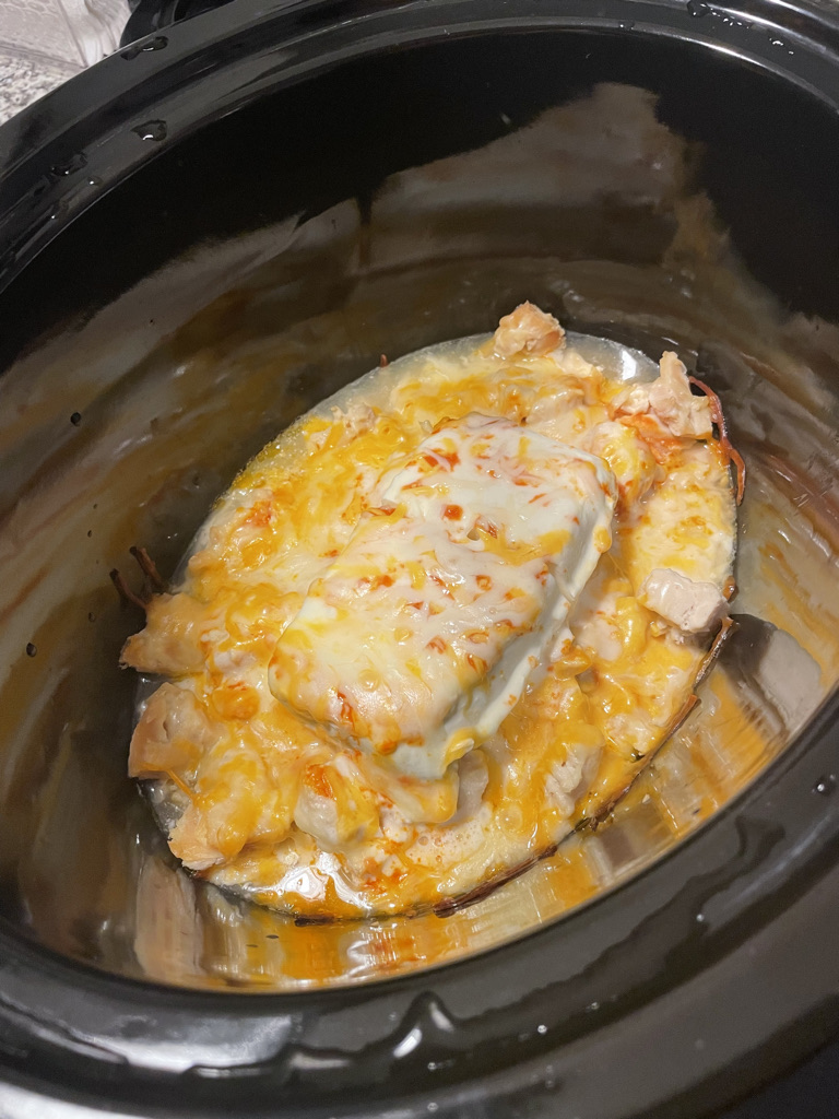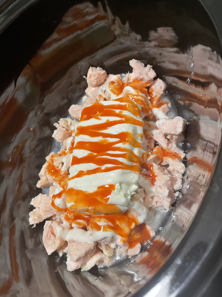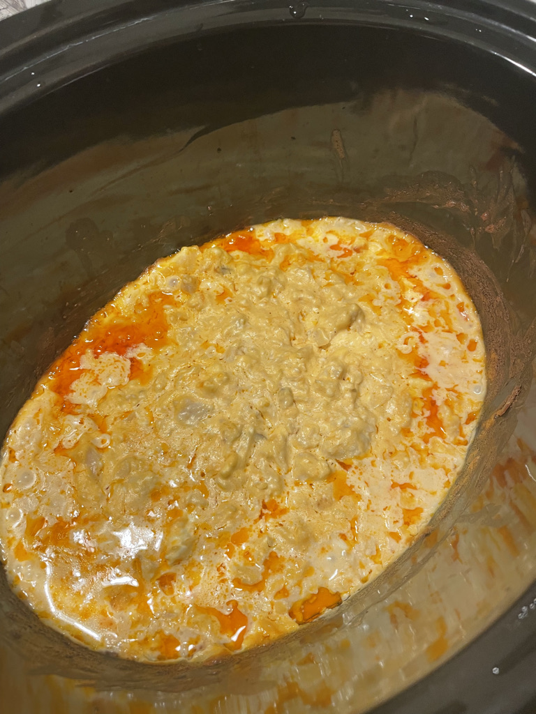 In my crock pot, I add two cans of chicken, one block of cream cheese, hot sauce, blue cheese, and any cheese I have on end. My favorite cheese to use are cheddar and mozzarella. I do measure, this is a dump recipe and that’s the best way to make it. Pending how fast I need this dip to be ready, I will set to high or low. High only needs about an hour or so.