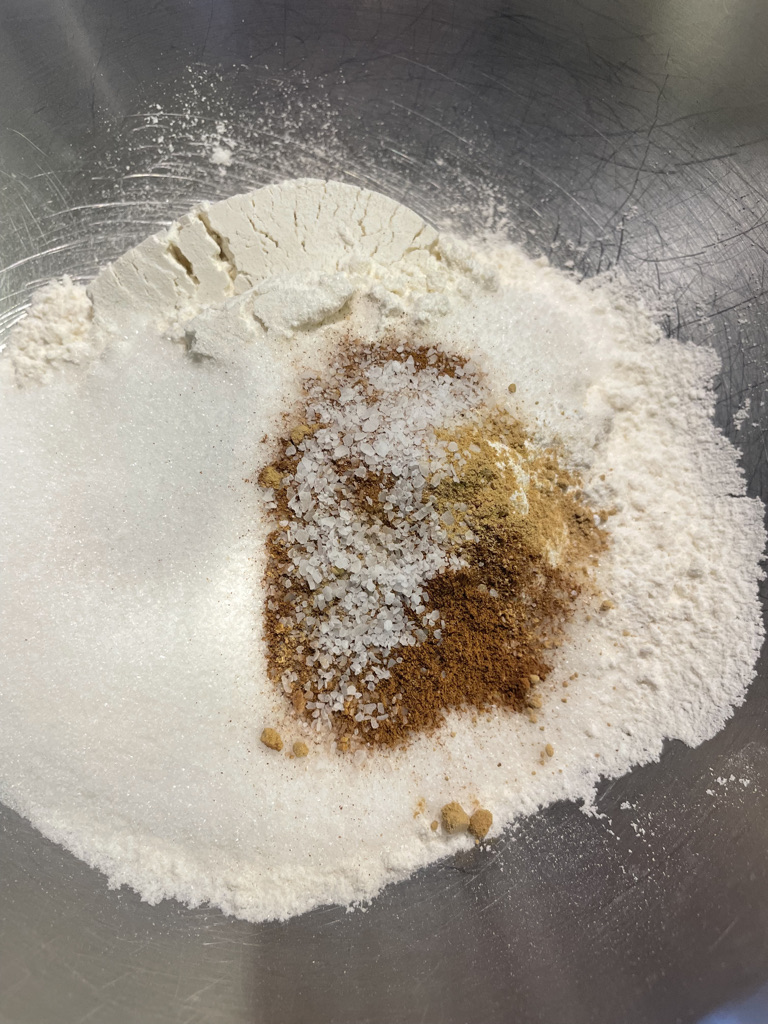 It was a super easy recipe to follow! Start by preheating the oven to 400. I sprayed my silicone muffin molds and placed them in the muffin tin. In a bowl, I combined flour, sugar, baking powder, ground ginger, cinnamon and salt. In a separate bowl, I combined oil, milk, egg and vanilla. I slowly poured the wet ingredients into the dry while whisking them together. I did not want to over mix the batter.