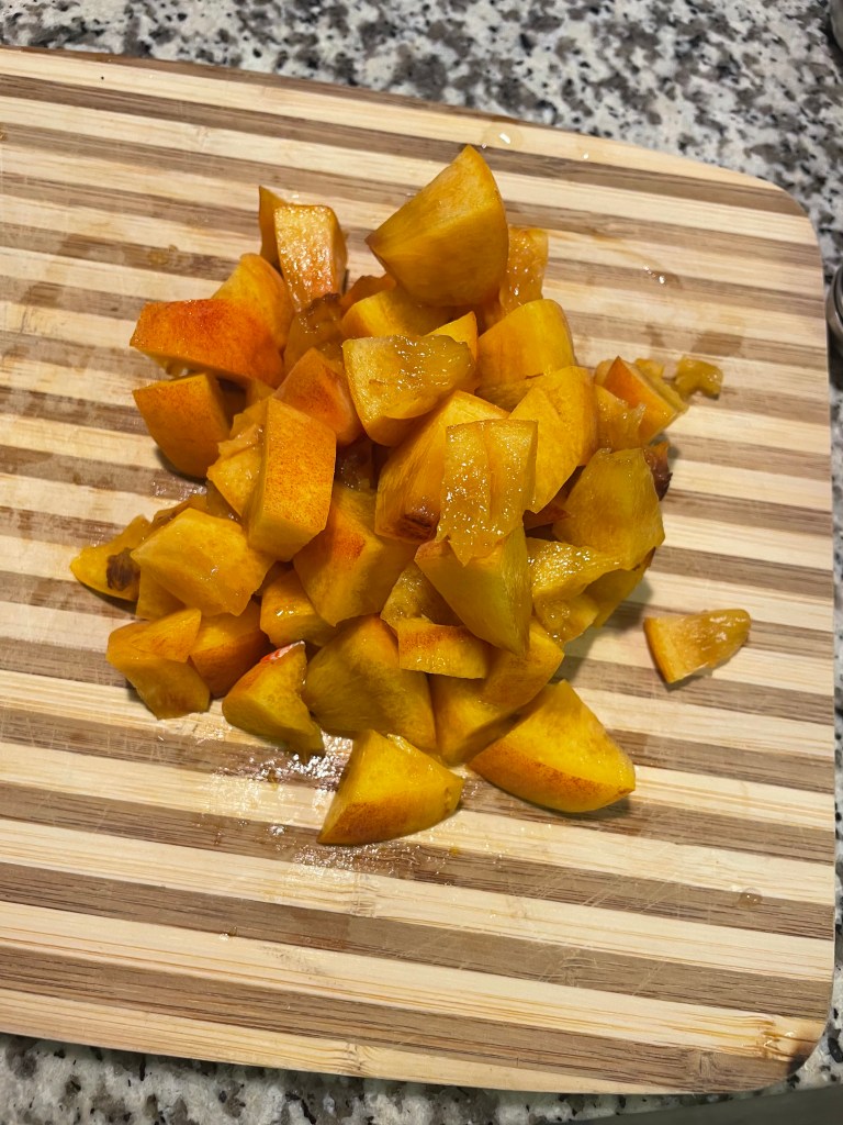 We had some dinner plans at a friend’s house and I was in charge of dessert. Not going to lie, I was tempted to just buy a dessert. I love eating it, but it really isn’t my favorite thing to cook or bake haha. My go to dessert would be something chocolate peanut butter, but I like to mix it up every now and then. So, I had to brainstorm and see what I could to make with ingredients I had. That is when I decided to use the peaches and I make muffins!!