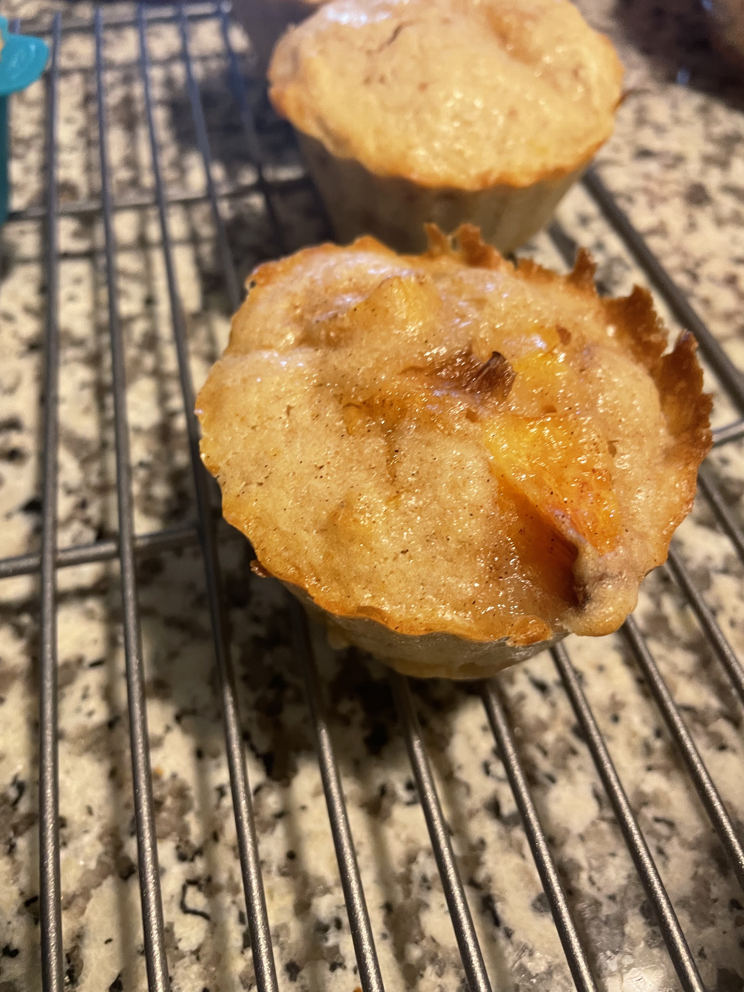 Next, I gently folded in the peaches. I scooped the batter into the molds until they were about ¾ full. I sprinkled the top of each one with a cinnamon sugar. I baked them for about 17-20 minutes; until the tooth pick came out clean.
