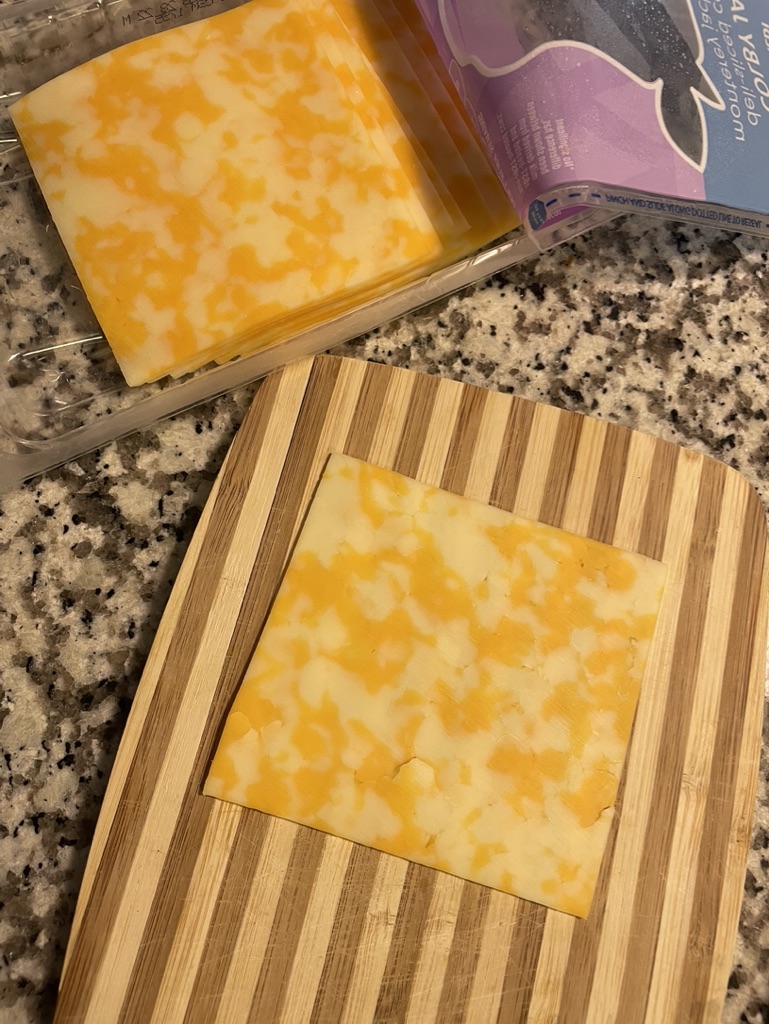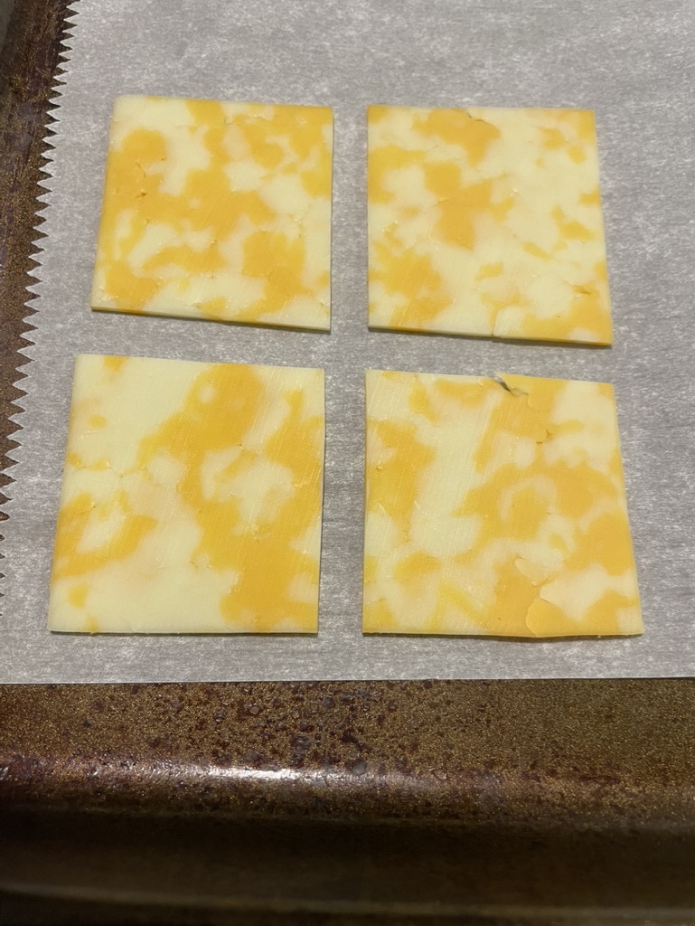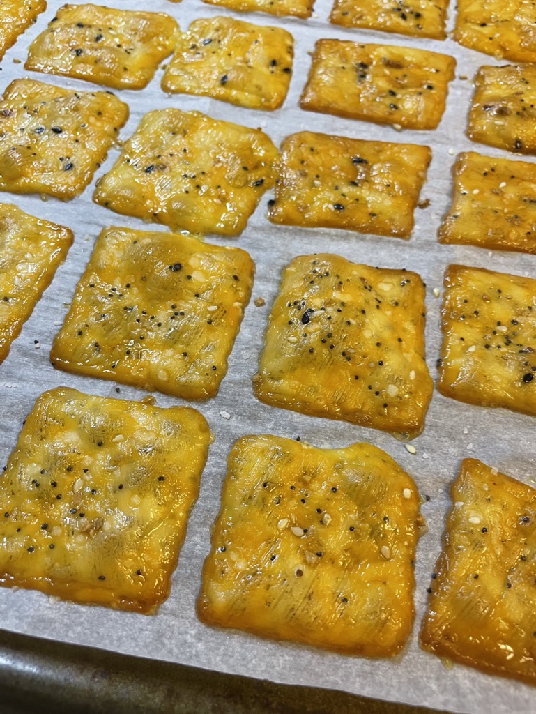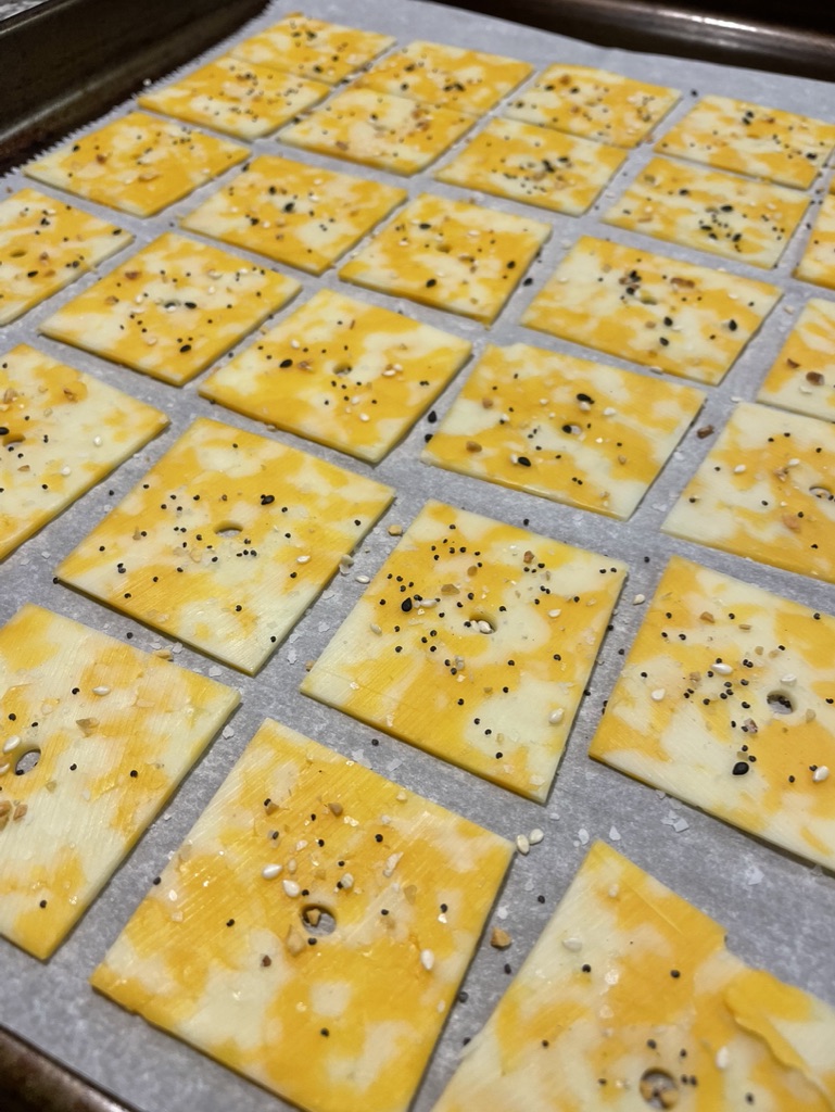 It’s super quick and easy. Preheat the oven to 275. I cut my slices of Colby jack cheese into 4 squares. I placed them on a parchment lined baking sheet. I then took a straw to poke a hole in the center of each square. I sprinkled them with salt and everything but the bagel seasoning. I baked them for about 30 minutes, until they were golden brown and crispy!