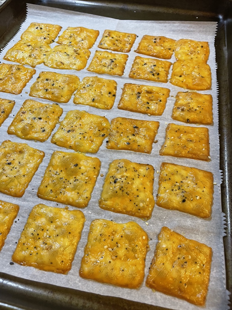 It’s super quick and easy. Preheat the oven to 275. I cut my slices of Colby jack cheese into 4 squares. I placed them on a parchment lined baking sheet. I then took a straw to poke a hole in the center of each square. I sprinkled them with salt and everything but the bagel seasoning. I baked them for about 30 minutes, until they were golden brown and crispy!