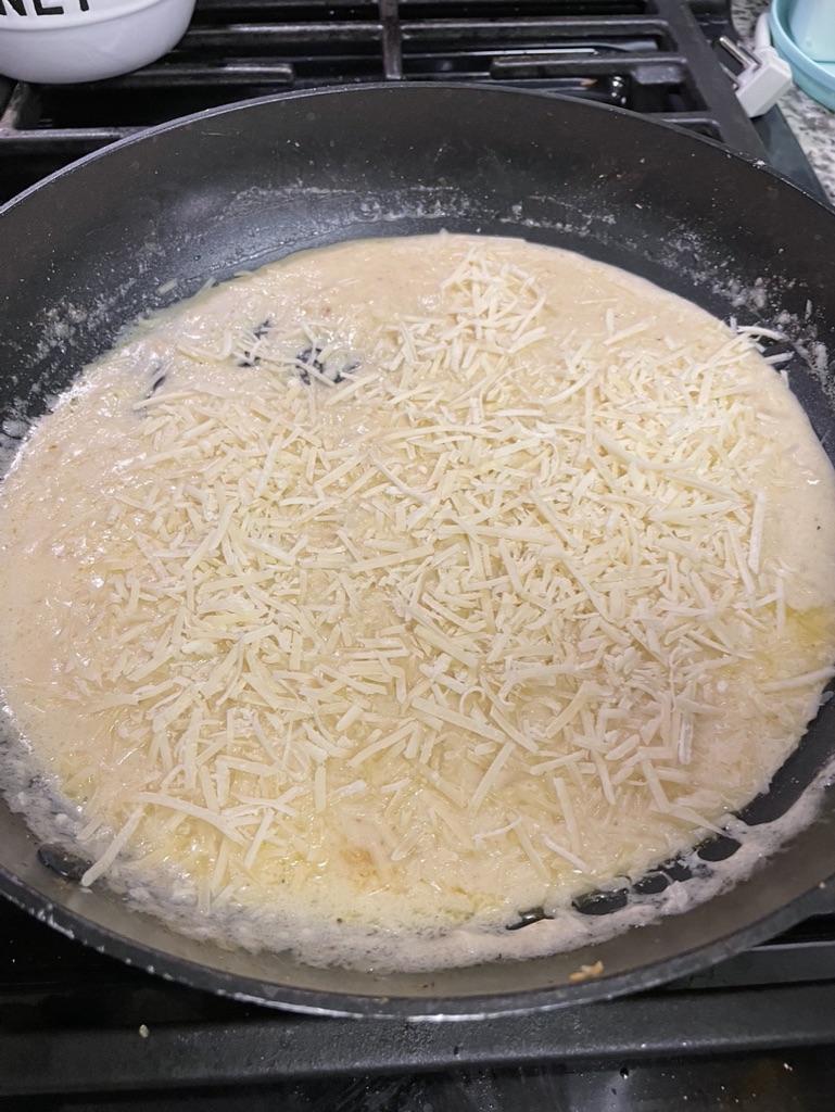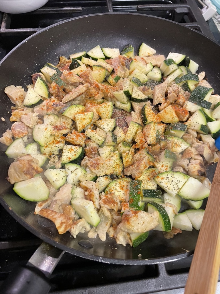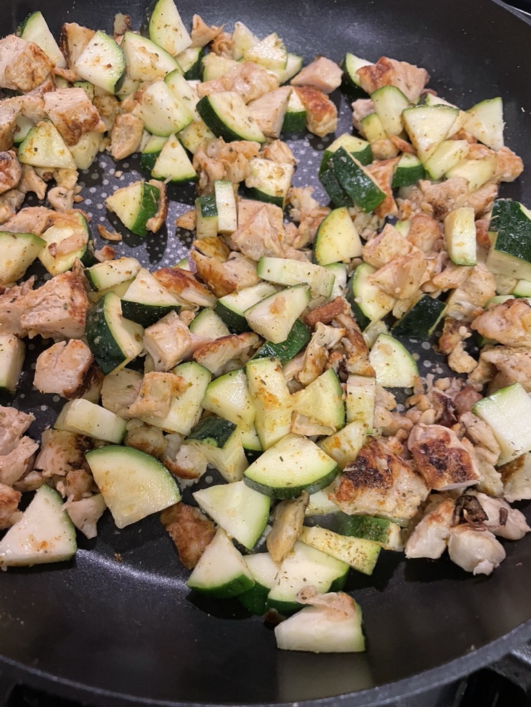 I started my pasta water first. Then I sautéed some frozen grilled chicken, some zucchini I chopped and minced garlic in a pan. I seasoned with salt, pepper, onion powder, adobo seasoning, Italian seasoning and paprika. After a few minutes, I removed all from the pan. I added a couple table spoons of butter and flour to start a roux. Next I added heavy cream and mixed until the roux formed. I seasoned with some salt, white pepper, ground mustard and a bit of season salt. Lastly I added shredded parmesan cheese.
