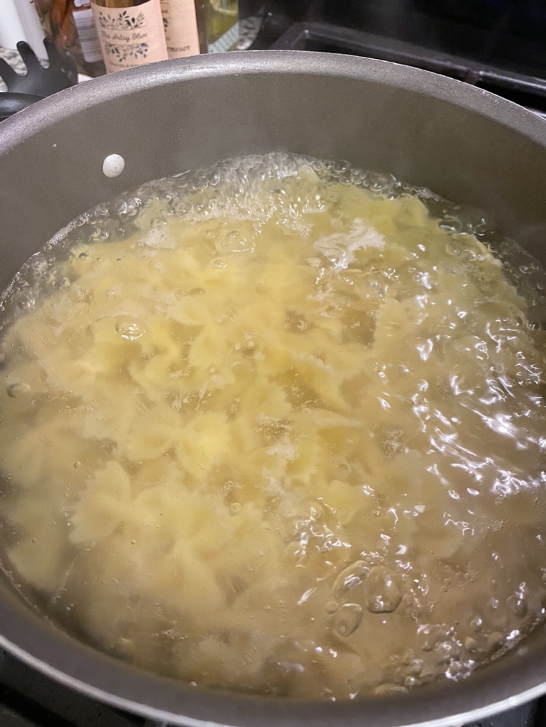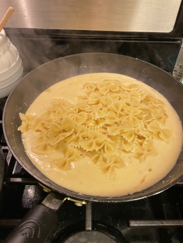 When the pasta water was ready, I dropped the bow ties. Once the past was done, I added it to the sauce, adding a bit more parmesan as I combined it all together (LOL). When the bow ties were coated with the sauce I added the zucchini and chicken.