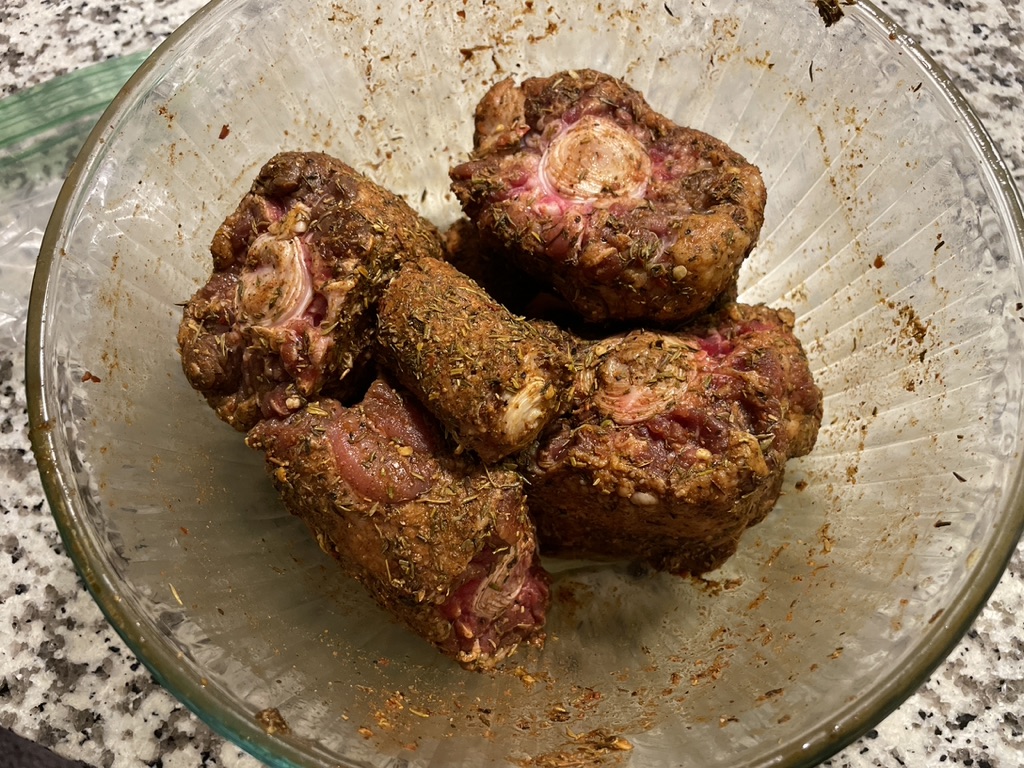 I first seasoned the oxtail and refrigerated them over night. I seasoned with salt, black pepper, white pepper, paprika, steak seasoning, ginger and lots of Caribbean jerk seasoning. I also added a bit of soy sauce and woreshire sauce.  I took the oxtail out of the fridge about 1 hour before I was getting ready to cook it.