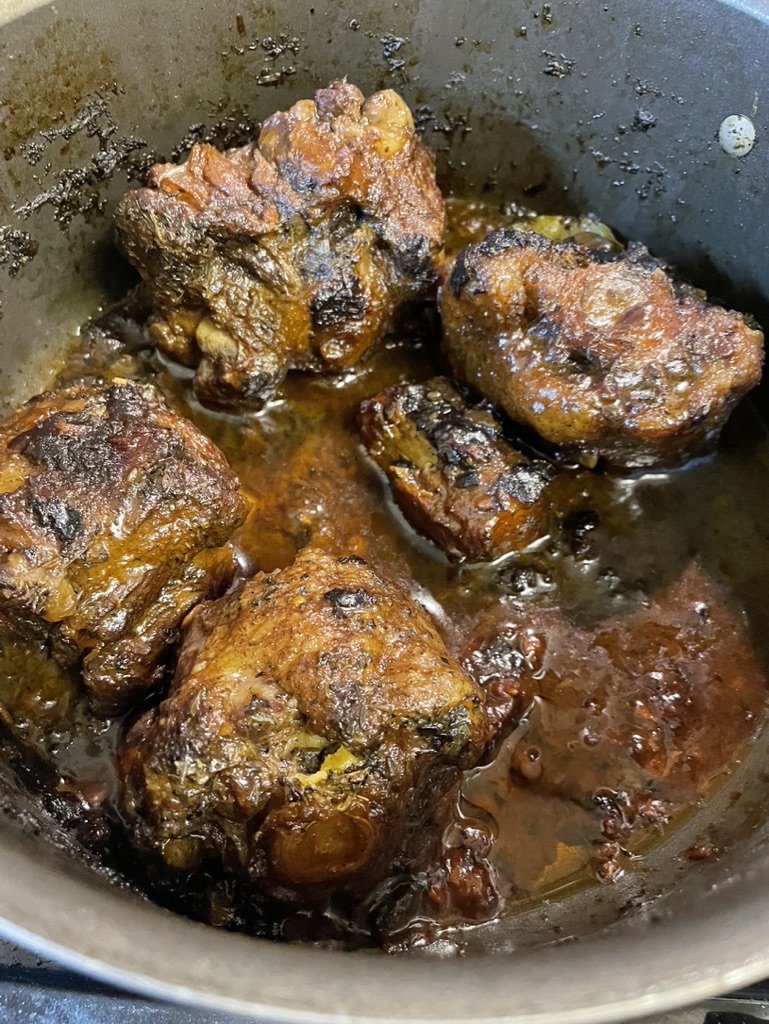 In a pot, I heated oil and then seared all sides of the oxtail. I then removed them and added half a chopped onion, 2-4 minced garlic cloves and sautéed them for a few minutes. I then placed the oxtail back in. Added about 2 cups of beef broth and water until the oxtail was covered (about 2 cups). I added a bay leaf and covered with a lid and allowed it to simmer low and slow for about 1.5-2 hours.
