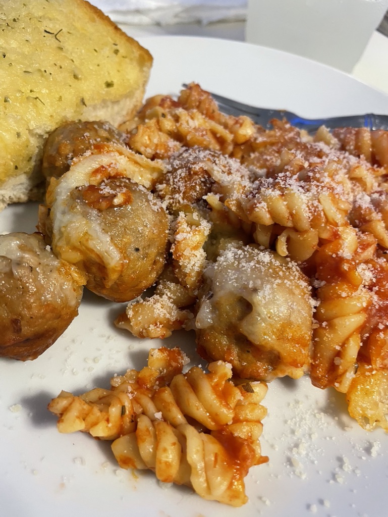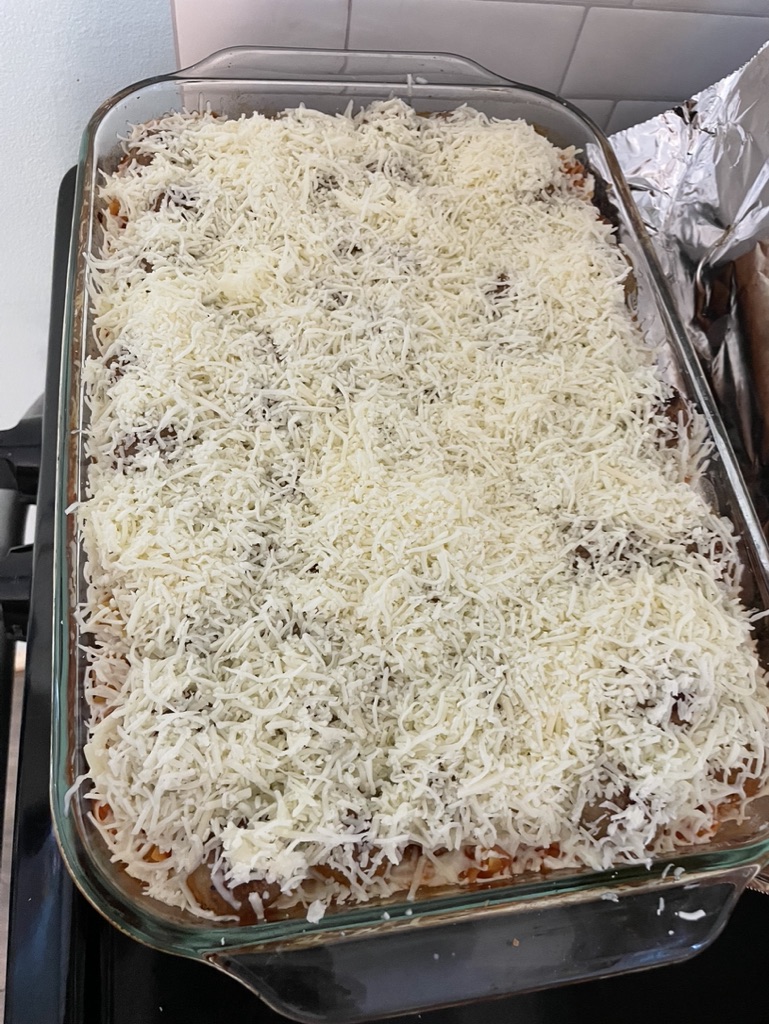 Then take out the dish, cover with cheese and recover with foil and bake for about another 20 minutes. We placed the garlic bread in the oven as well and all finished at the same time. It turned out to be a delicious Italian dinner (so much so that we decided to have 2 rounds LOL)! It was easy, quick and definitely will be made again. I think next time I will try alfredo sauce and some froze grilled chicken and maybe some spinach! I think the options can be endless!