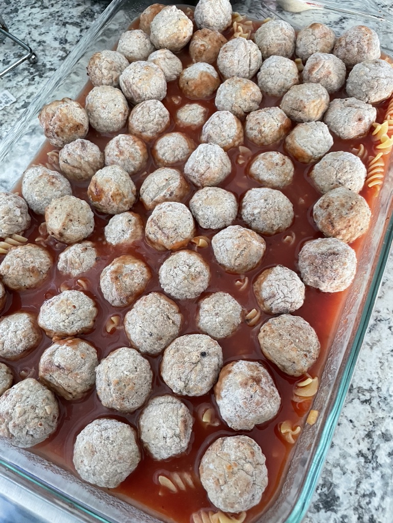 This recipe is a dump and bake and it so yummy you would never know! First preheat the oven to 425 and take a glass baking dish and spray with cooking spray. Then add your pasta, and jar of sauce. Fill the jar with water and add that as well (24 oz is 3 cups so not measuring tools needed!). Stir until all ingredients are well combined. Next add the frozen meatballs (they can be thawed out a bit). Cover the dish with foil and bake for about 35 minutes.